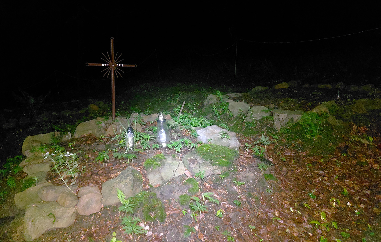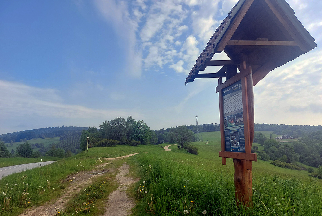 Po raňajkovej slanine ma začína trochu „sušiť“, ale aj s tým som počítal, a tak pijem koľko mi chutí, už som blízko k vode. A ozaj, pri kostole na poľskej strane sedla Cigeľka je okrem iných stavbičiek aj normálna studňa. Akurát odchádza školský výlet a v plechovom vedre ostalo po detiskách ešte dosť parádnej, čerstvo naťahanej vody – to je almázia! Lebo ďalšia možnosť dotankovať je až na 99. kilometri, pod vrcholom kopca Stávok pred Duklou. To by mala byť istota – síce malý pramienok, ale voda tam bola aj koncom augusta, počas Rusínskej stovky.