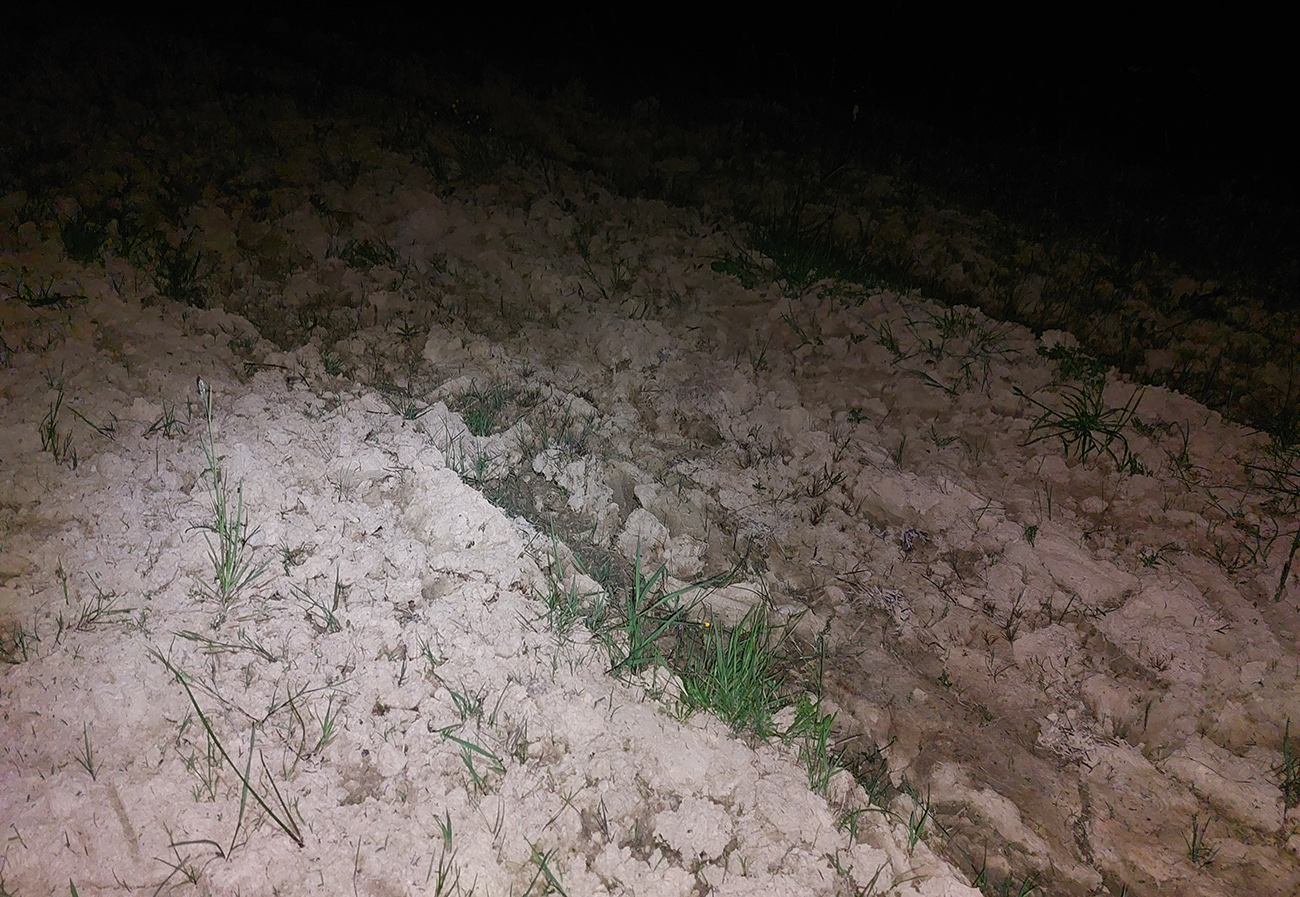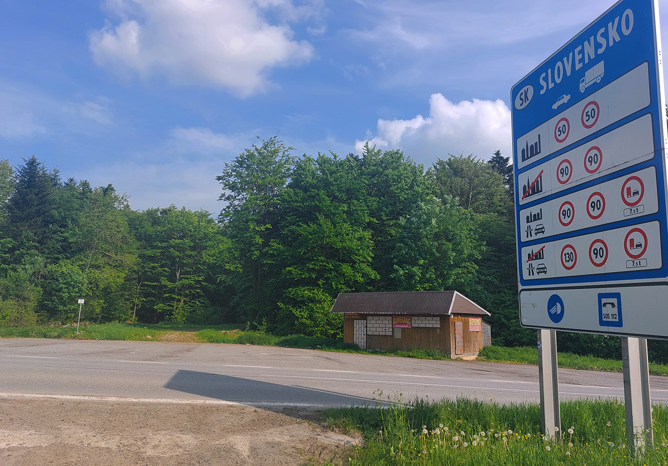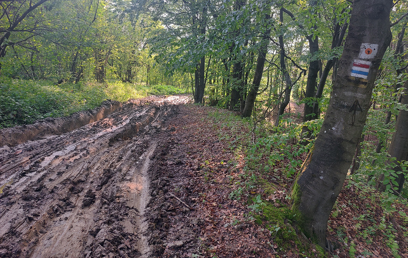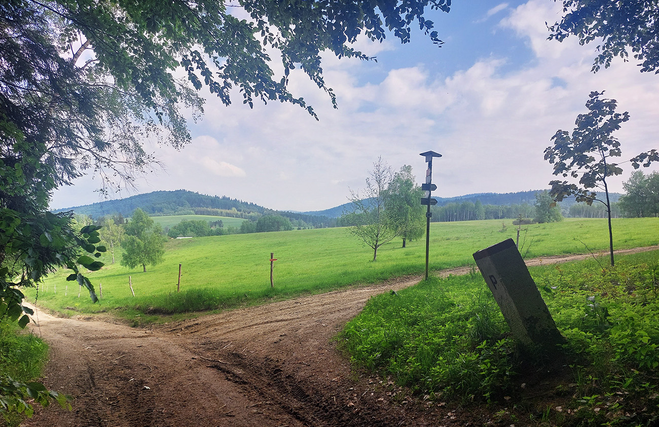 Lebo nasleduje odbočka cez potok, chvíľka na normálnej lesnej ceste a koniec srandy. Nasledujúca odbočka doprava vedie do strmého svahu, len dákym priesekom pomedzi stromy. Ten ma vypľúva na lúku a ďalej čo? Cesta nikde, tráva po pás. Smer je jasný len podľa gps, tak idem a hľadám ďalší vstup do lesa. Hovorím si „veď dobre, na mape je toto len chodník, o chvíľu sa napojí na cestu“. Hej, napojil som sa – na najhnusnejším možným spôsobom rozbitú a konármi zahádzanú zvážnicu. Na križovatkách s ďalšími podobnými „cestami“ problém, kade ísť, na lúkach hlboké stopy po traktoroch, za mostom cez Uličku naopak neexistujúce cesty a zase len prieseky medzi stromami. Značky niekde megaveľké, niekde zbytočne nahusto, inde ale chýbajú práve tam, kde ich najviac treba. Oddych pre hlavu a jednoznačnosť cesty len na kúsku starej asfaltky, kade vedie aj cyklotrasa. Potom zase divočina a až keď ma to vypľúva na spevnenú cestu dolinou potoka Kertenovatec, už som „v suchu“ - do Uble je to už len rovno za nosom, mierne z kopca. Na hranicu dorážam o štvrtej ráno a budím samozrejme pozornosť policajtov, že čože si to tam fotím. Aj im po vysvetlení trochu padajú sánky, ale nevolajú na mňa pánov s bielou kazajkou, tak pohoda.