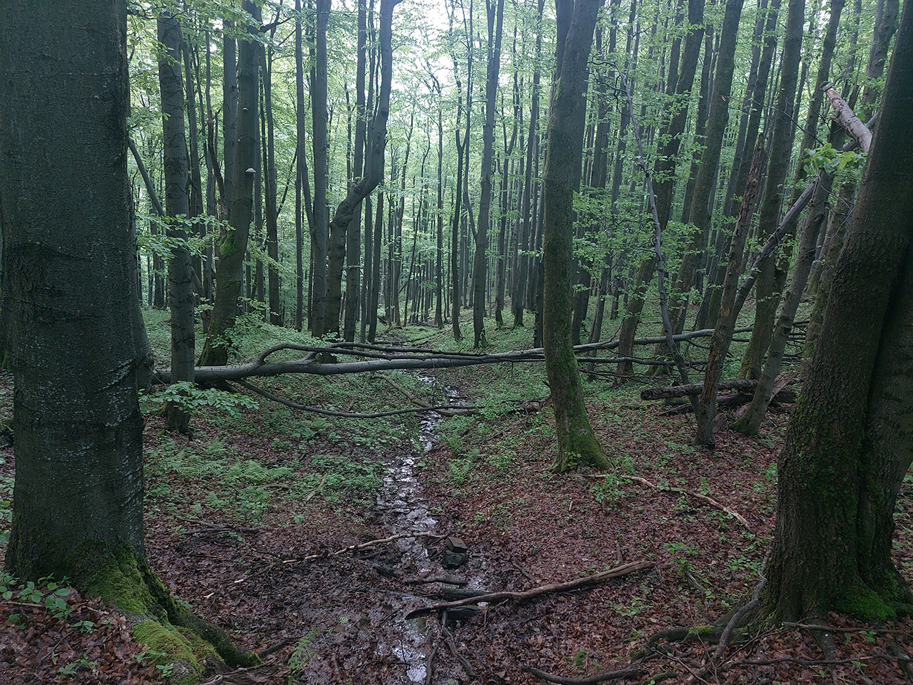 O pol štvrtej začína nebo blednúť a o štvrtej už všetky miestne spevavce vreštia ako divé. Vraj božské lesné ticho, no určite, hehehe... Krajina okolo Haburského rašeliniska je zaujímavá: zmena oproti bežným, kompaktným lesom doteraz, ako na prechádzke parkom si pripadám. Len v parku to pod nohami tak nečvachtá. O pol piatej balím čelovku, aj v prítmí lesa už vidím dobre. Ešte som si naposledy zasvietil do vodojemu, ktorý ma ale napriek očakávaniam a názvu sklamal. Je to len ruina. Na jej dne síce rúra a z nej výdatne tečie voda na pohľad lákavá, ale v mojom stuhnutom stave by som musel podať poriadny gymnastický výkon, aby som sa k nej dostal. Našťastie nemusím a po Balnicu ešte nejaké pramienky budú. V tejto „druhej polovici“ to s vodou už nie je také zlé ako pred Duklou.
