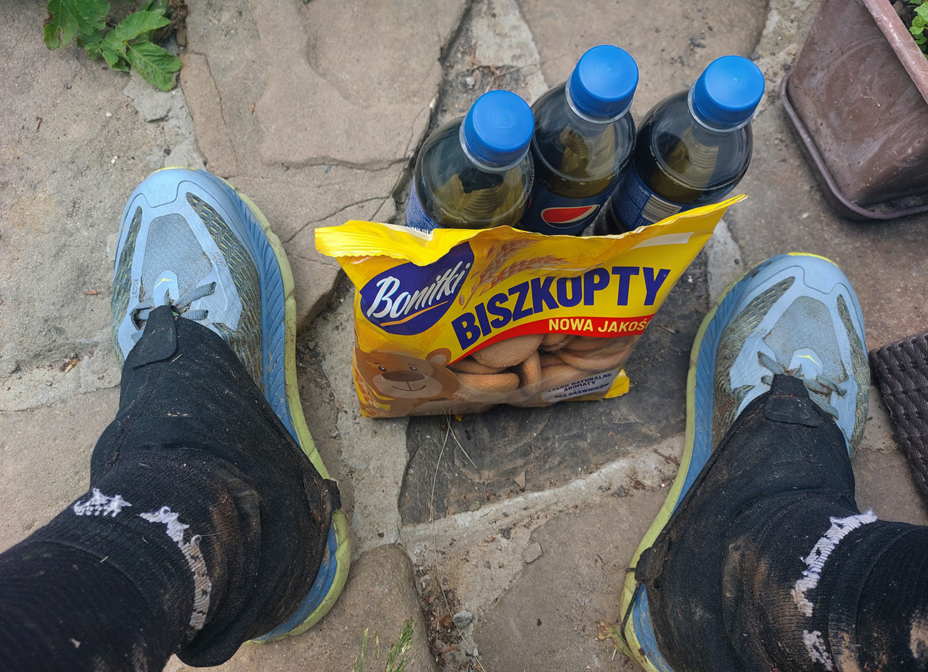 Z parkoviska radšej mierim rovno za farebnými neónmi pumpy na poľskej strane a čudné myšlienky zaháňam sumarizovaním postupu prehadzovania batoha a „nákupného zoznamu“, nech sa tam dlho nezdržujem. Prechádzam z jonťáku na colu, poriadne sladím čokoládovými tyčinkami, jednoducho zdravá večera! Toto a nejaké vlastné zásoby ma musia preniesť nocou a potom až do Balnice, čiže o nejakých 70 km a 12 hodín ďalej. Tam zas bude obchod a obed. Teta za pultom je na kadejakých nočných exotov asi aj zvyknutá, ale keď na jej otázky (odkiaľ a kam a prečo) odpovedám, trochu jej padá sánka.