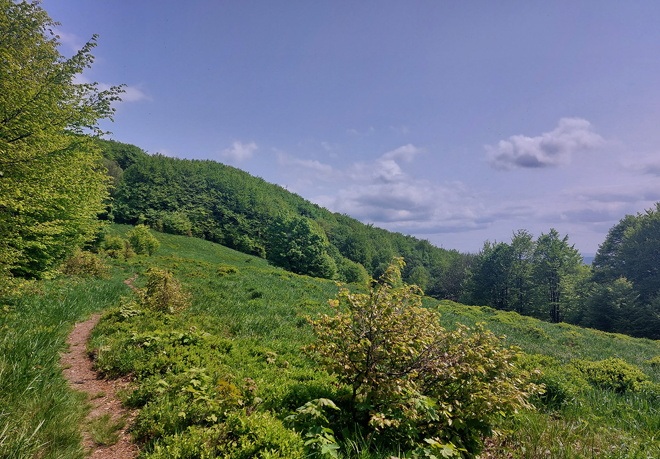 Za sedlom Dujava znovu nejako viacej lúk. Pekné rozhľady, ale cesty niet a tráva vysoká, pre istotu zapínam gps. Sklony sa zmierňujú, ale aj cesta sa zužuje do chodníka a tunel sa často uzatvára konármi a krovím. Okolo sedla Zajačí vrch to pod nohami niekde aj čvachtá, niekde treba aj kľučkovať, v početných koľajach stojí voda. Zrazu čo to, halucinácia? Nie, to len hraničiar na koni ide oproti. Nechápem, ako sa tade dokáže predierať a ako sa niekde zohýna. Za ním dokonca bikepacker tlačí svoj naložený stroj. Tak tomu závidím ešte menej. Pred Polianskym sedlom je lesný priesek na dlhšiu chvíľu naopak zase široký, navyše takmer rovný a bez prevýšenia, kluskanie až taká rozkošššš!