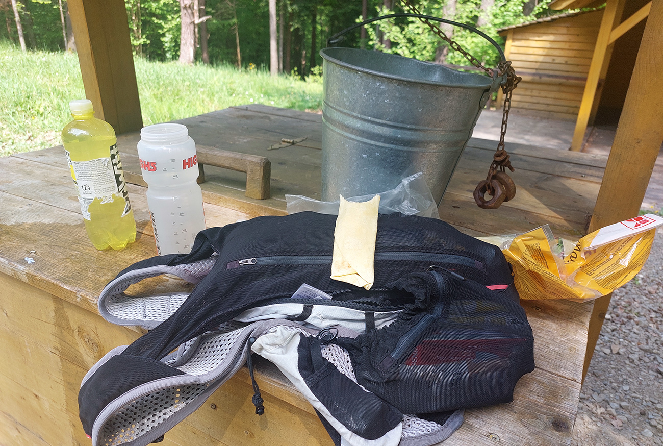 Na Kráľovej studni (22. km) tankujem do brucha aj do fliaš čo to dá, lebo najbližšia voda bude vraj až na 52. km, v sedle Cigeľka. Zatiaľ ale stačí, osobne nemám veľkú spotrebu vody, navyše počasie mám ideálne. Ráno bolo zatiahnuté, ale po vlhkom a teplom týždni začal fúkať poriadny severák. Hore v korunách poriadne hučí, mňa dole akurát dobre ovieva, a ešte som aj v tieni. Len keď ma občas vyhodí na lúky, cítim silu slnka. Hlina pod nohami v lese je ale taká akurát, nelepí ani sa nepráši.