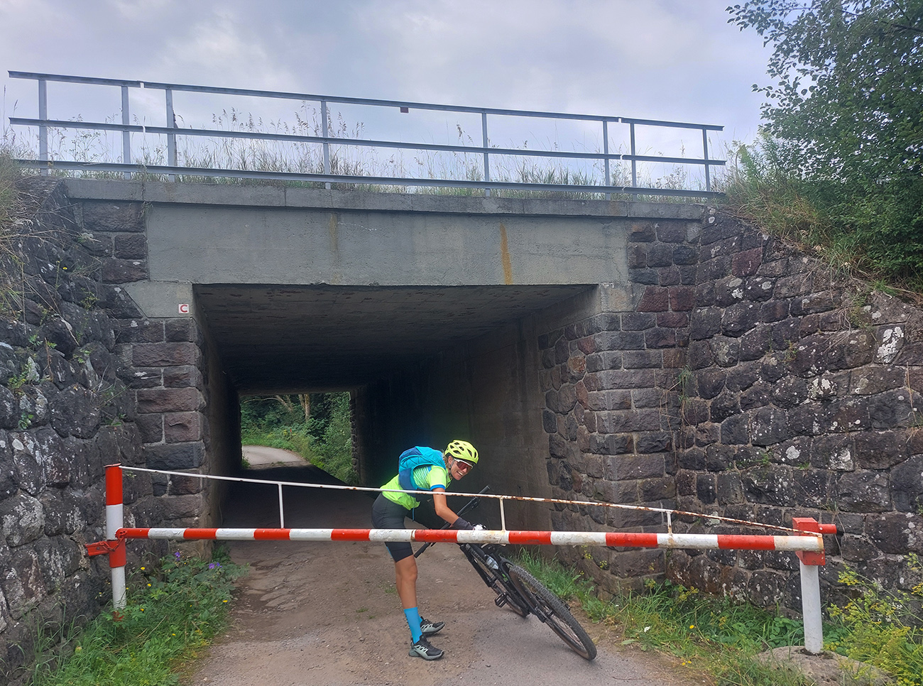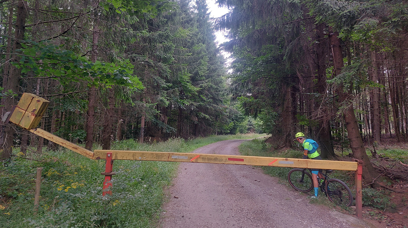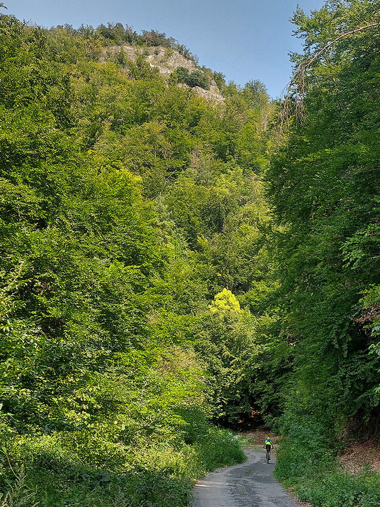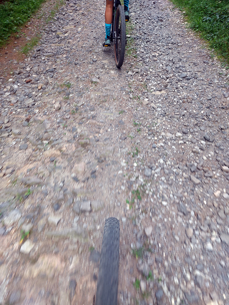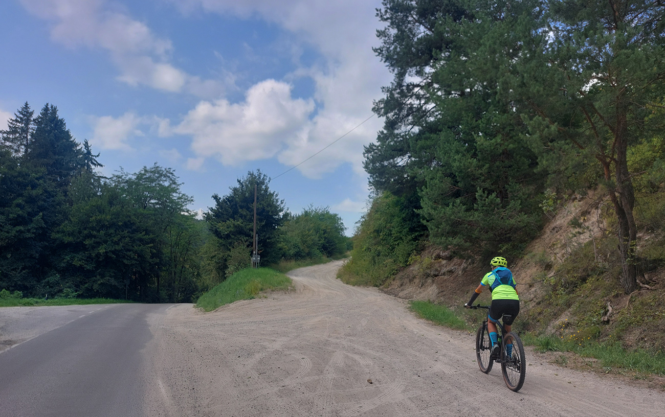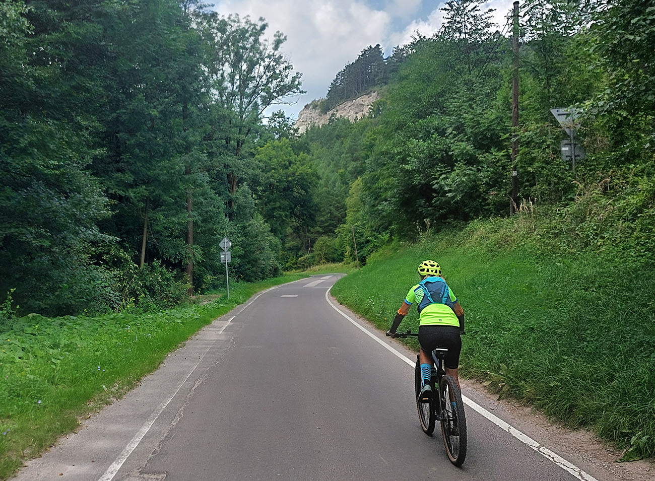 Takže úvod – dlhý, asfaltový, lebo od vlaku. S výhľadmi na masív pohoria vpredu, potom cez Rovnú horu po novom asfalte. Taký rovný, luxusný pokračoval aj von zo Skleného cez lúky za železnicou. Až v dlhom stúpaní Rovnou dolinou sa zmenil na nepríjemne rozvoľnený a hrubý makadam, striedaný hrboľatou šutrocestou. Aj dole sa tade ide zle. Potom pauza na predýchanie pri trhacej jame nad Kunešovom a išlo sa ďalej.