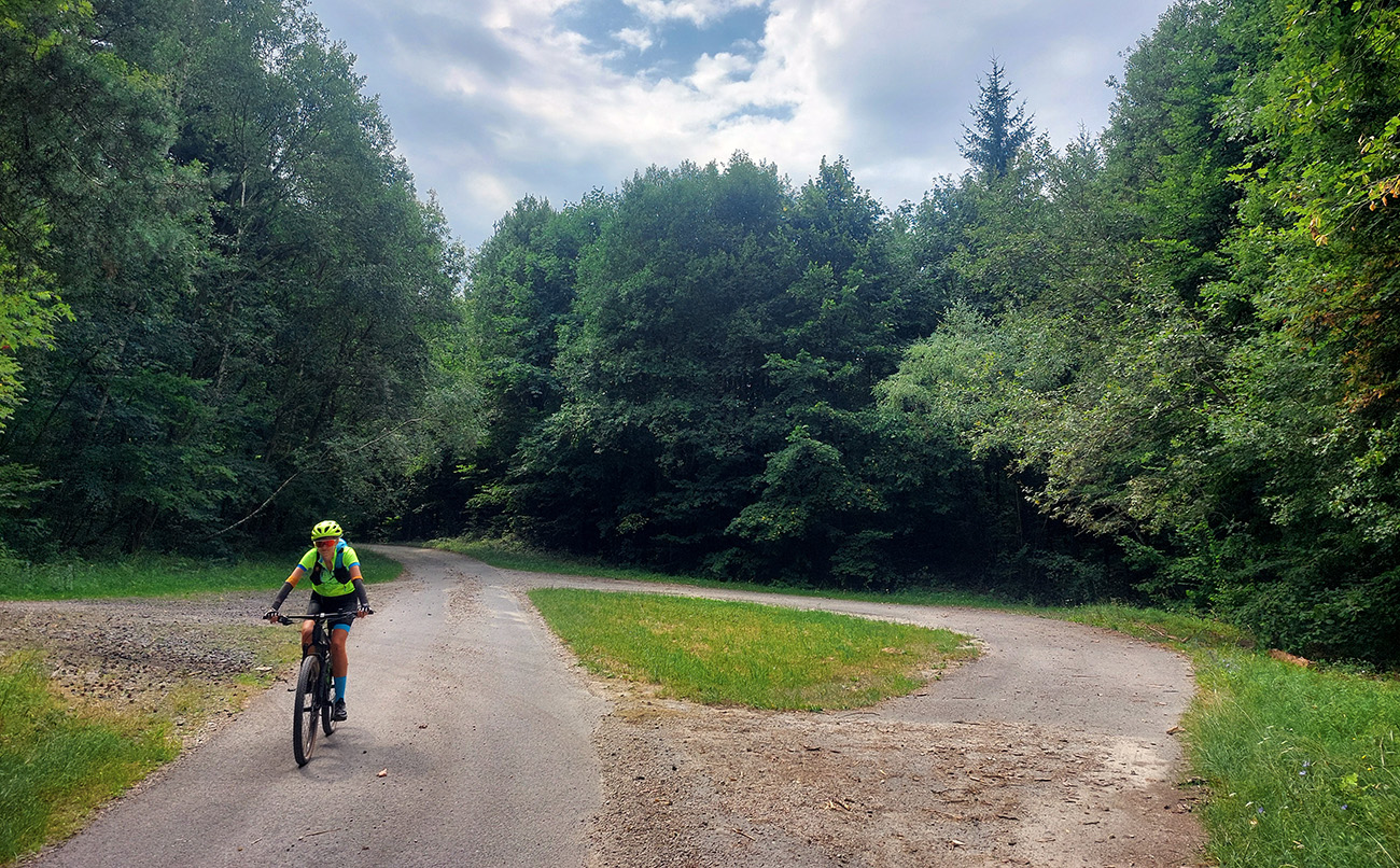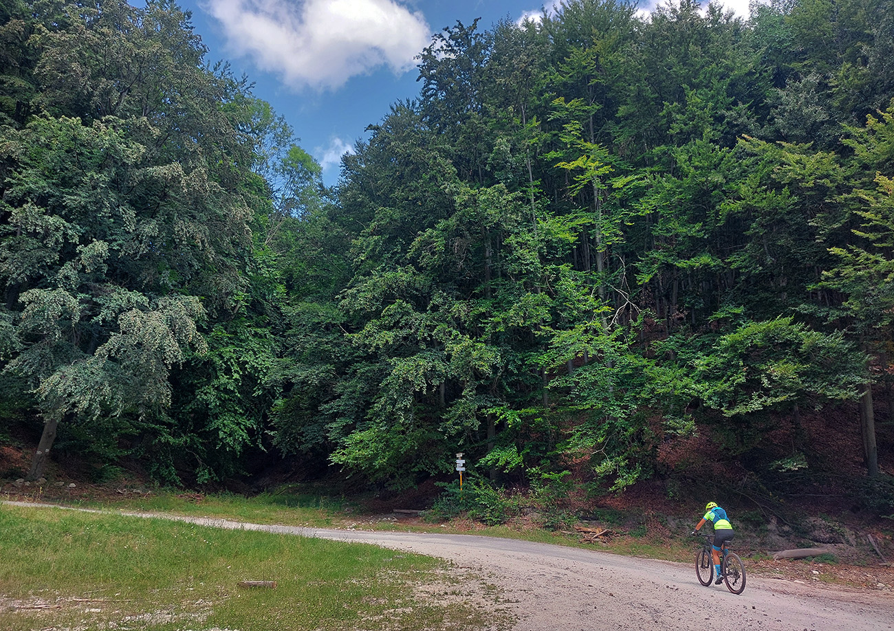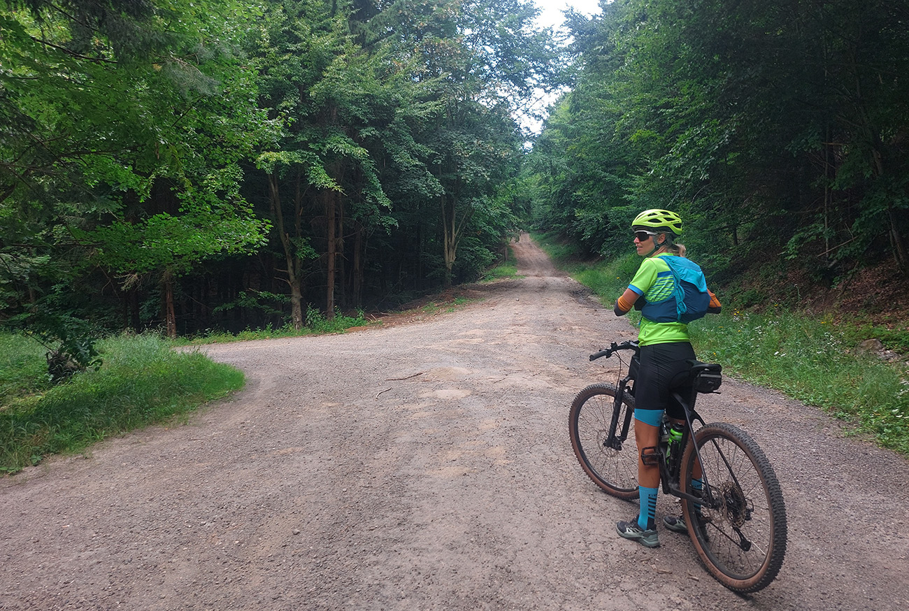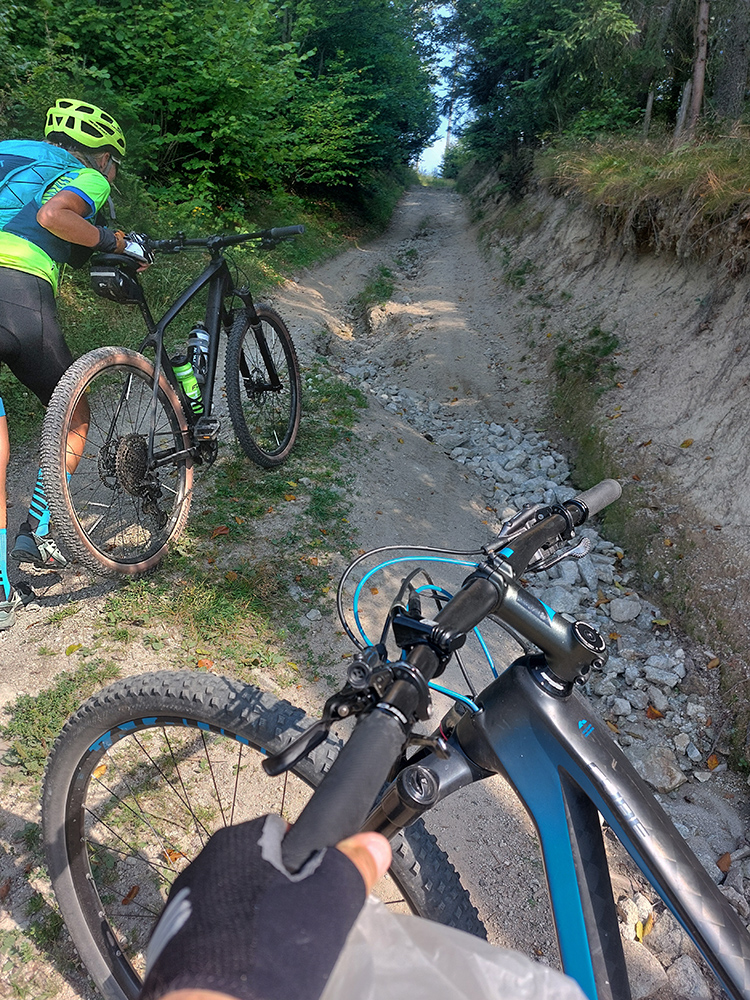 Znovu sa objavila požiadavka na „sprievodcovské služby“, a zároveň bolo treba zvoliť lokalitu, ktorú svojimi búrkami nezasiahne a nezamočí prechádzajúci front. Takže padla voľba na južnú časť Žiaru medzi Turčianskymi Teplicami a Handlovou, kde je na mrte pevných (aj asfaltových) lesných ciest a už ten kút máme tu na Vetromagu viackrát zreportovaný (odkazy sú dole). Technicky to nie je náročné jazdenie, zato ale ani výhľadov nie je veľa, väčšinou sa ide lesom. No také príjemné je to, že sa môžu dvaja vedľa seba v pohode vykecávať za jazdy. Naklikal som nejakých 90 km s možnosťami predĺženia aj skrátenia, ale vďaka frontu sme začali trochu neskôr, tak sme mierne upravovali. Na vzdialenosti sa to však takmer neprejavilo. Jednou zo zásadných vecí na trase bol prieskum „použiteľnosti“ spojky medzi východnými (nad Kunešovom) a západnými traverzami (ponad Handlovú), cez sedielko medzi Havraňou skalou (864 m) a Vysokou horou (909 m). Spojka pobiede použiteľná, o tom viac nižšie, takto to celé dopadlo, so začiatkom a cieľom v TT: