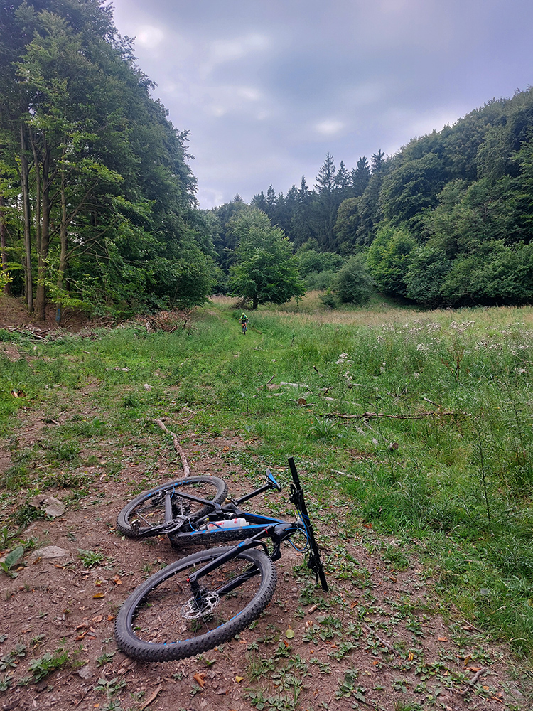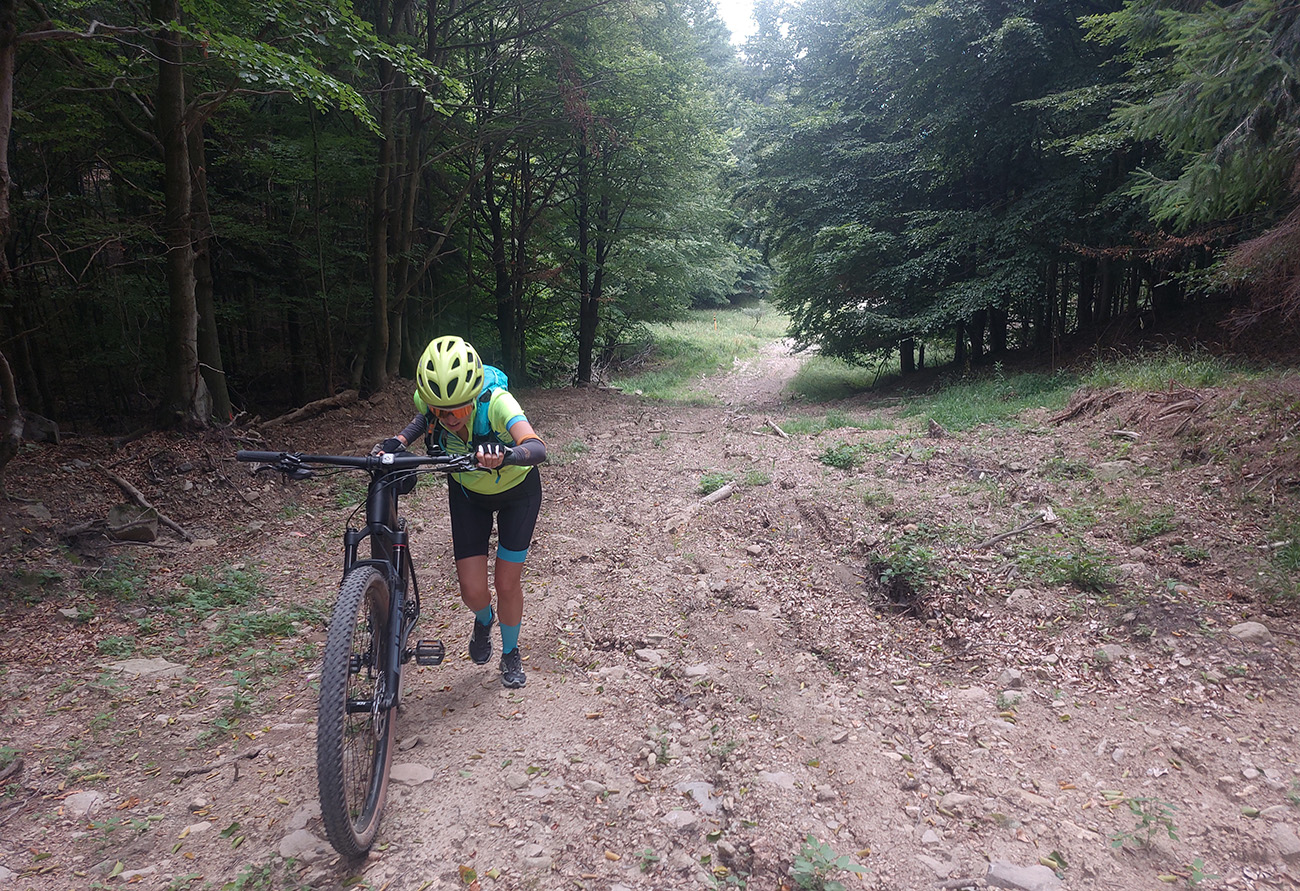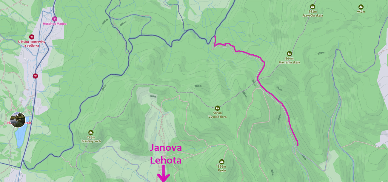 Hore v Bielej doline (na zákrute) začalo to overovanie, či sa tade dá na druhú stranu, na parádnu traverzovku, vedúcu z Handlovského sedla cez Rematu v podstate až niekam nad Nedožery a Pravenec. Výsledok takýto: cesta v mape je, stopy po bajkoch na nej tiež, dá sa. Ale nie príjemne, dosť rozbitá bola akurát (od lesnej techniky), aj sme potlačili. Ale nie je moc strmá smerom hore ani dole. Na Heatmaps takmer nič (zvýraznil som ju fialovou), trochu používanejší je susedný prejazd z Janovej Lehoty popod Trasľavý vrch: