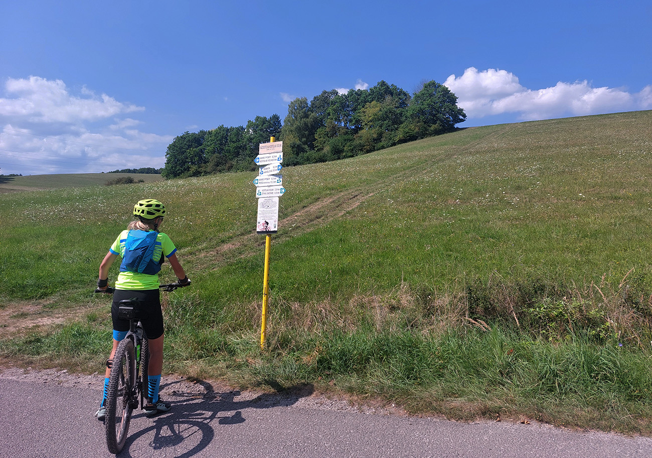 V postupe na sever nás zastavil až čas a smerovník na spoji našej modrej cyklotrasy so zelenou (Žiarska radiála, č. 5318), stúpajúcou na „hrebeň“ na Štyri chotáre. Tak sme ju využili a po vyše šiestich kilákoch mierneho stúpania (dole asfalt, vyššie šotolina) sme sa ocitli pri šípkami naježených smerovníkoch – a že teda čo ďalej. Lebo pod kolesami ani nie prach, ale púder, kopy dreva, nič moc estetika prostredia. A taký mám zafixovaný skoro celý hrebeň tejto južnejšej polovice Žiaru.