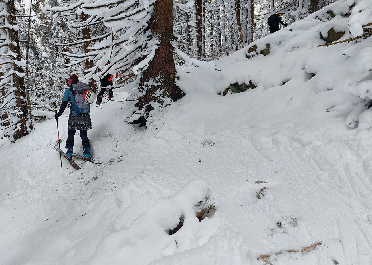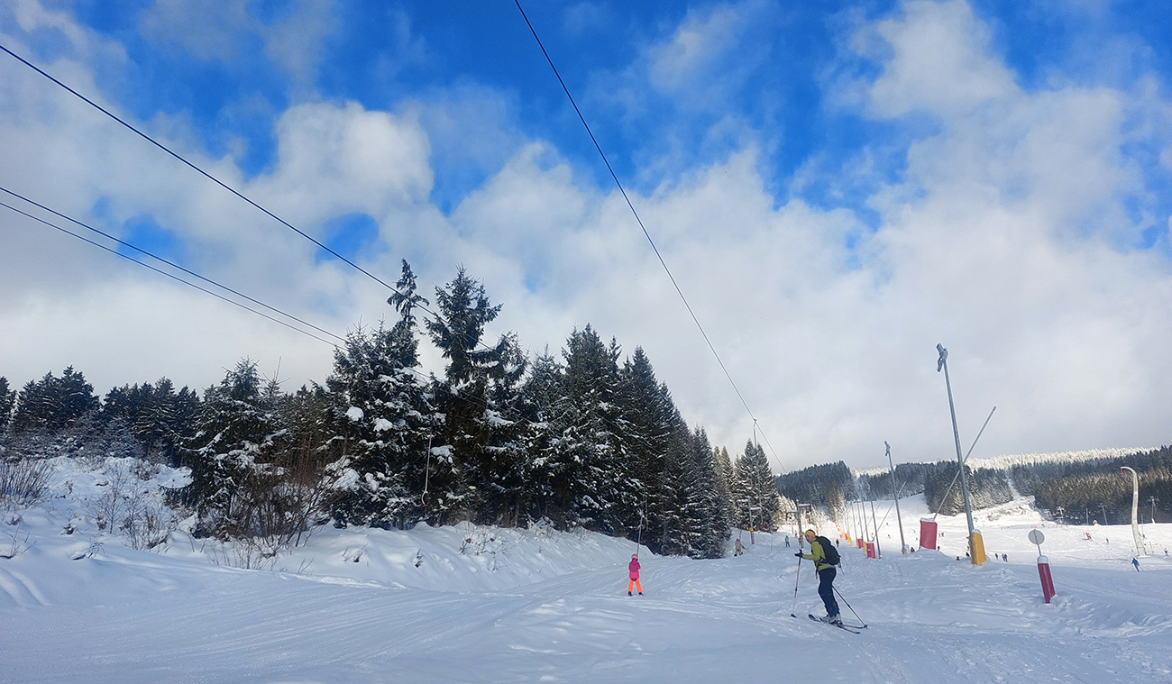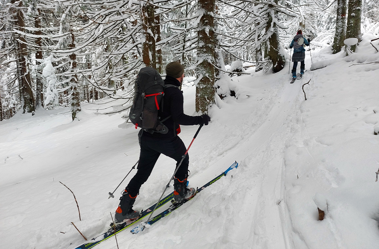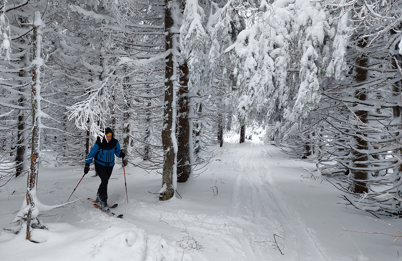 Na Orave padlo bieleho akosi viac ako vo Fatrách, sa zdalo. Tak sme vyrazili do istoty päťeurového parkovného a mali sme šťastie ešte na tom najspodnejšom parkplaci, ktorý sa brutálne rýchlo plnil. Pred deviatou. Potom len kúsok popri vleku a šmyk doľava, na modrú značku. Megakomfortné rozchodenie pre dvoch aj troch vedľa seba. Od silvestrovského sneženia ešte lesy krásne osnežené, ale stopy vyleštené ako koľajnice. Ozaj tak do 30 cm prášku. Lenže paličky škrtali o kamene, základ pražiadny. Do kopca ale super. Len 2,5 km a na výraznej križovatke nás ešte výraznejšie vychodená stopa odbočila prudko doprava z cyklotrasy, no najmä do strmšieho.