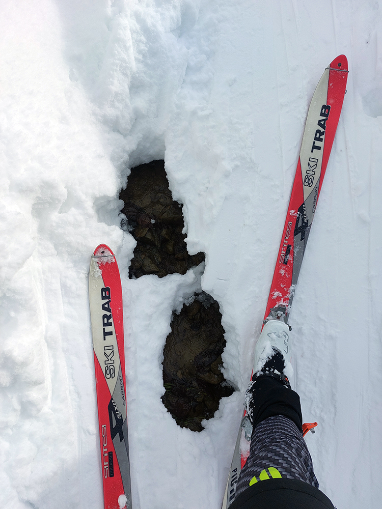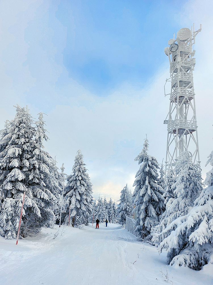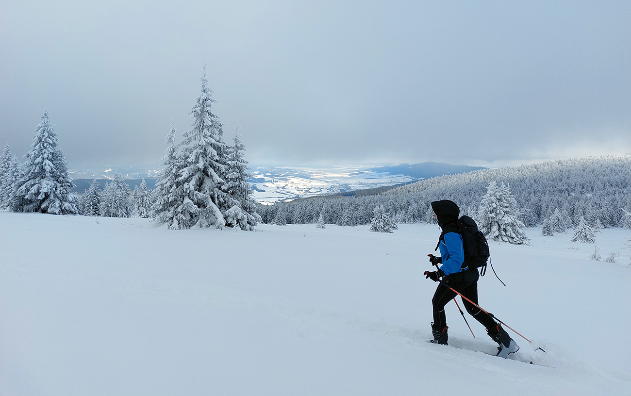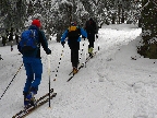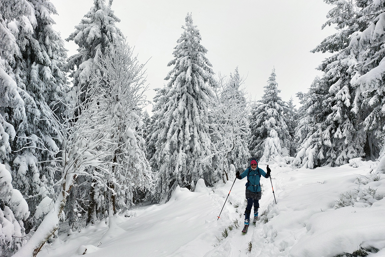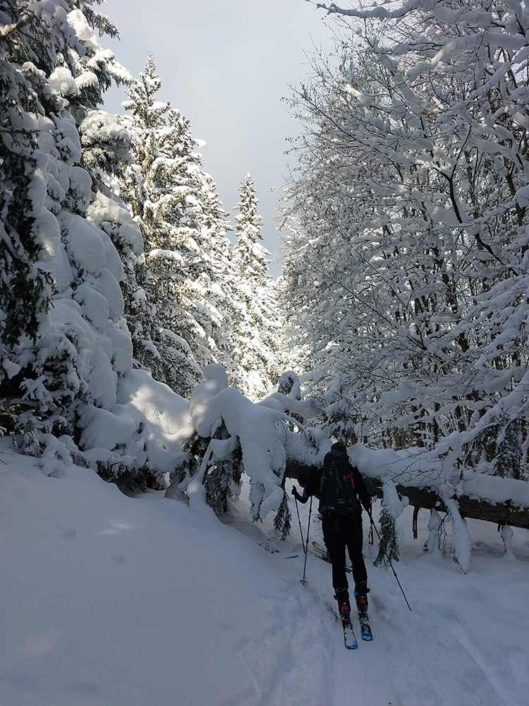 Na Orave padlo bieleho akosi viac ako vo Fatrách, sa zdalo. Tak sme vyrazili do istoty päťeurového parkovného a mali sme šťastie ešte na tom najspodnejšom parkplaci, ktorý sa brutálne rýchlo plnil. Pred deviatou. Potom len kúsok popri vleku a šmyk doľava, na modrú značku. Megakomfortné rozchodenie pre dvoch aj troch vedľa seba. Od silvestrovského sneženia ešte lesy krásne osnežené, ale stopy vyleštené ako koľajnice. Ozaj tak do 30 cm prášku. Lenže paličky škrtali o kamene, základ pražiadny. Do kopca ale super. Len 2,5 km a na výraznej križovatke nás ešte výraznejšie vychodená stopa odbočila prudko doprava z cyklotrasy, no najmä do strmšieho.