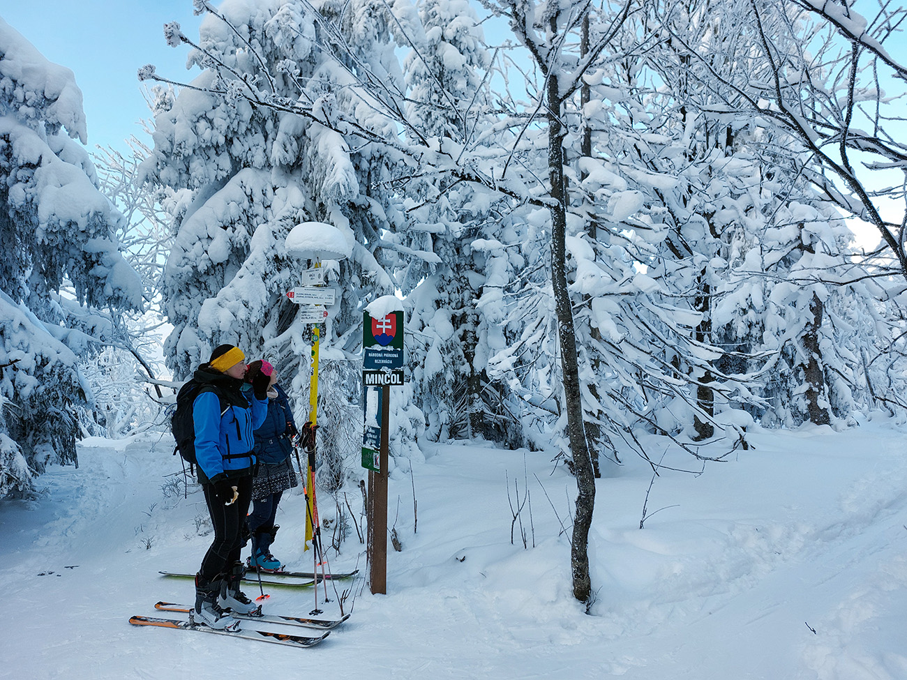 Takže sme sa hore pripojili na červenú značku a pekne od západu dorazili pomedzi jafury na Minčol. V takom pohodlnom, práškovom korýtku. Pri smerovníku sa nás nazbieralo vari šesť, na konci lesa pri útulni davy.