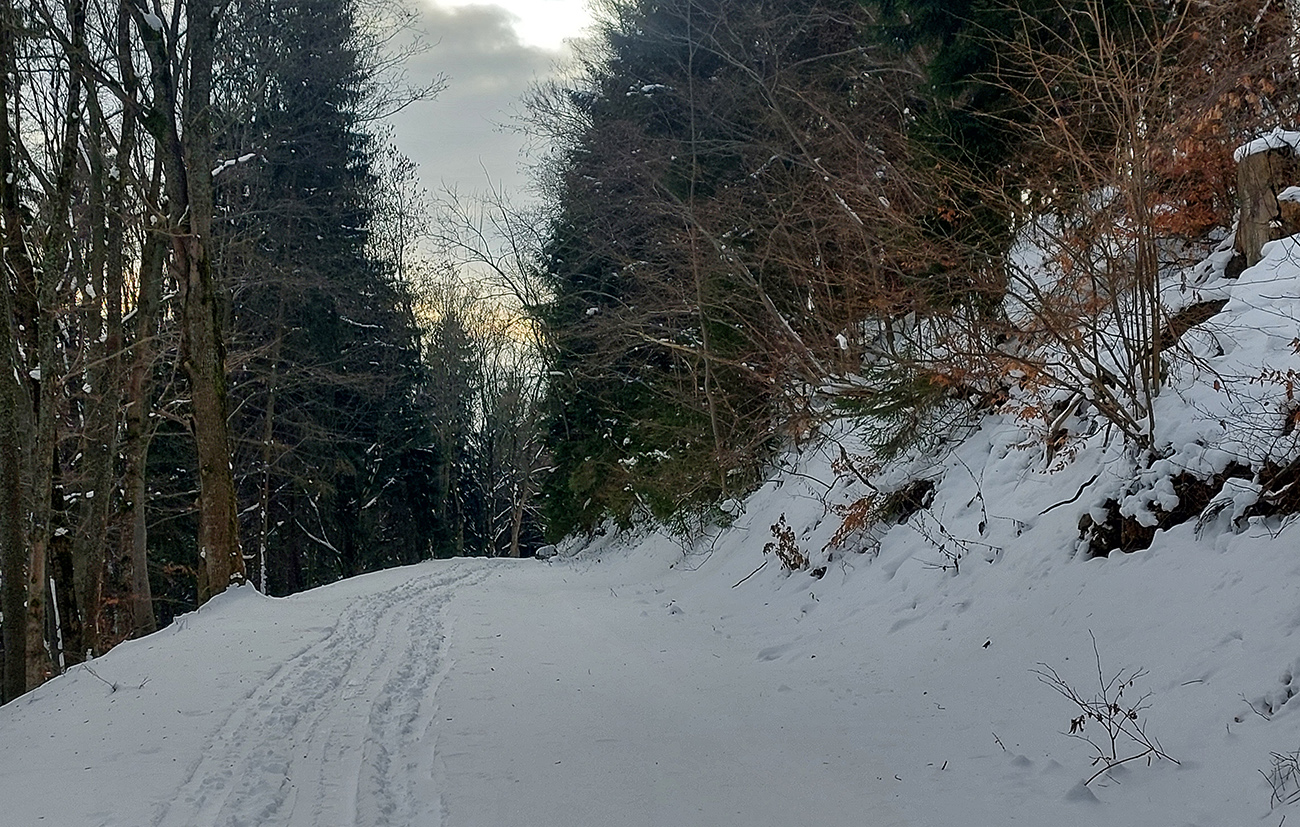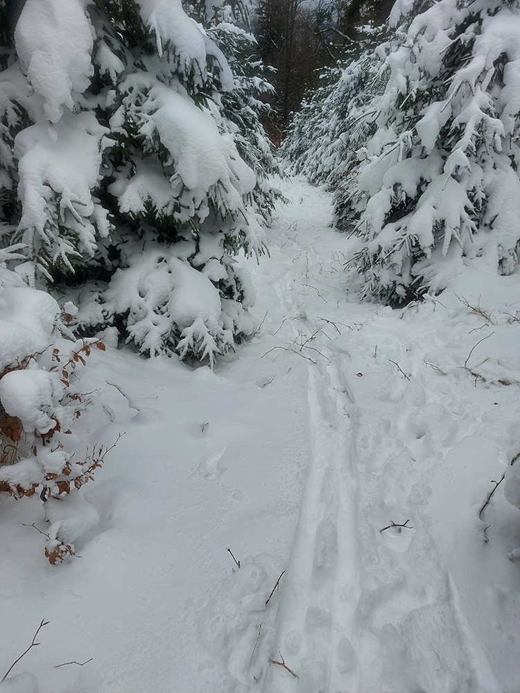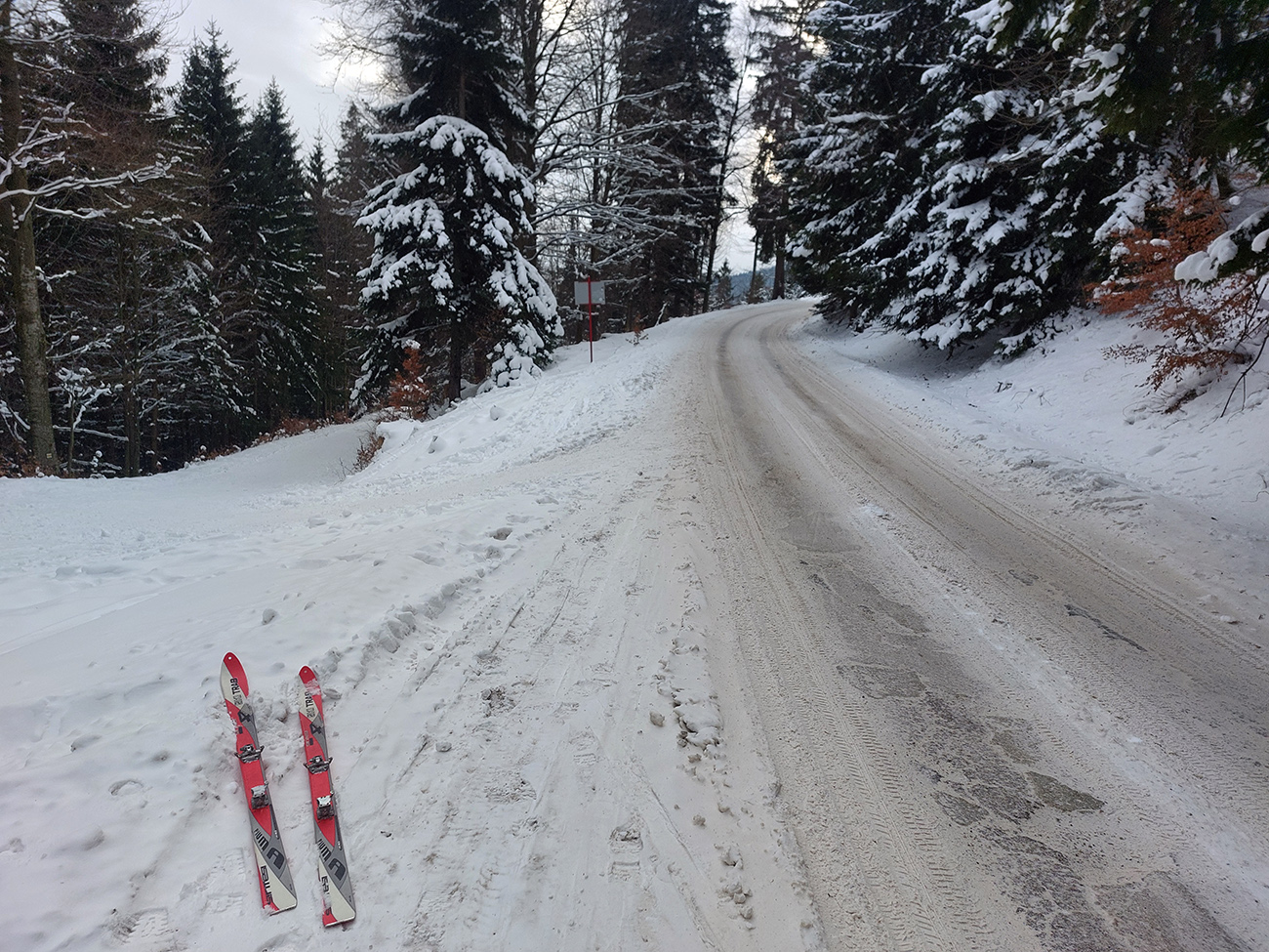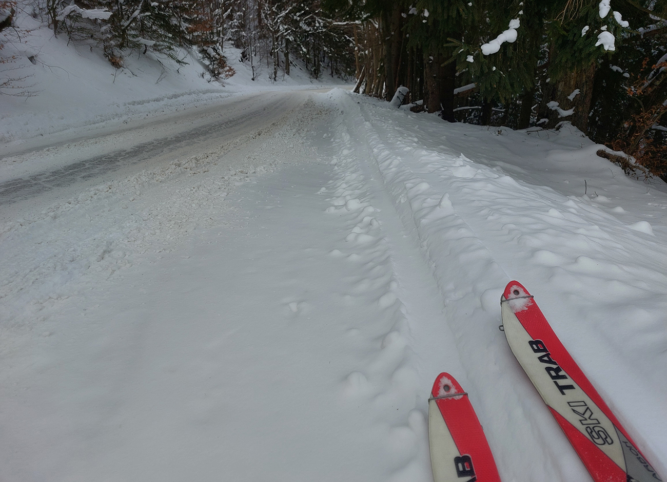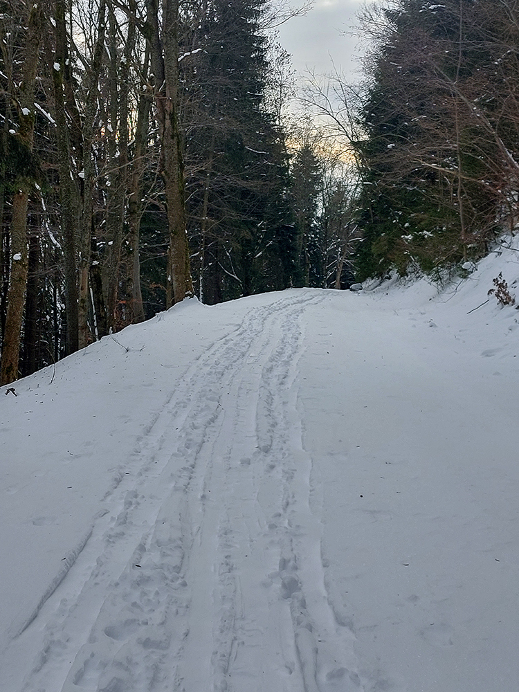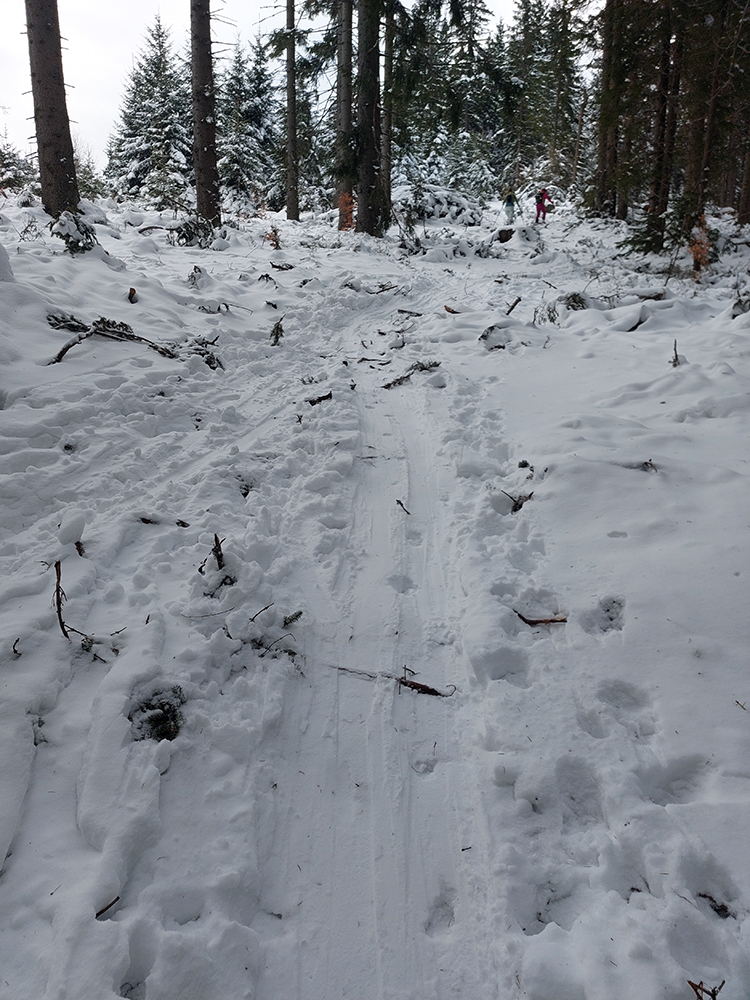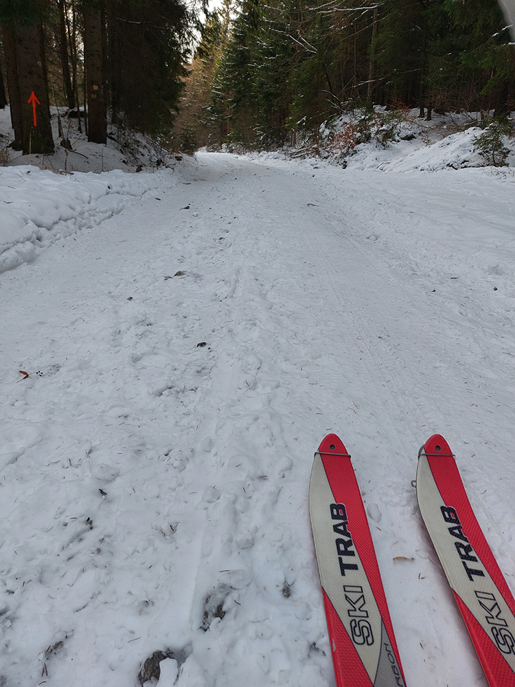 Jasná správa: kto chce ísť teraz na Hole na pásoch, oveľa lepšie spraví, keď pôjde z Vrútok a nie z Martina. Serpentíny zo Strání, spod starej lanovky (žltá značka) sú od mostíka také zodraté pešiakmi, že ažžžž. Zato od rampy v Jedľovinách, kde vyberajú poplatok za cestu, sa v podstate dá hore aj dole od auta. Zaparkovať je kde na dvoch malých parkoviskách hneď nad rampou. Cesta „investička“, ktorá odtiaľ vedie na tie Stráne, je spevnená, pokrytá pár cenťákmi autami ujazdeného a pešiakmi uchodeného snehu, ideál aj pre mtb. Síce na začiatku (medzi parkoviskami a za prvou zákrutou) cvakajú zubami húfy malých piraní, ale cestou hore je ľahké sa im vyhnúť a cestou dole sa dajú opatrne poobchádzať. Alebo už zniesť, je to k rampe ani nie 500 m. Od krmelca na prvom kopčeku je to už pohoda hore aj dole, samozrejme s trochou pozornosti. Takto to vyzeralo, len som na jednom mieste trochu experimentoval a moc to nevyšlo, na to upozorním nižšie. No v tejto biede treba improvizovať, čo už...