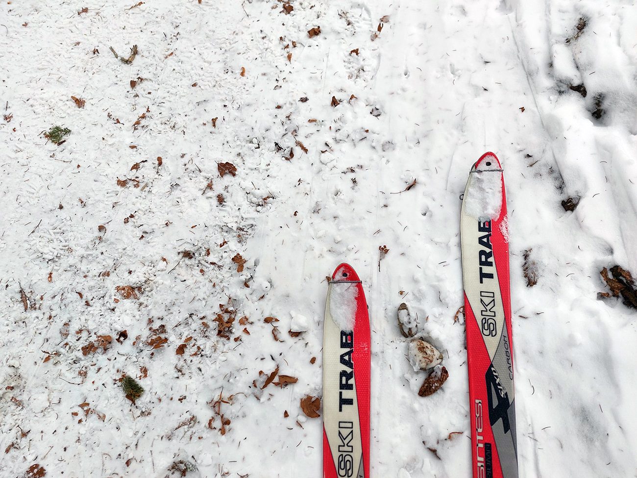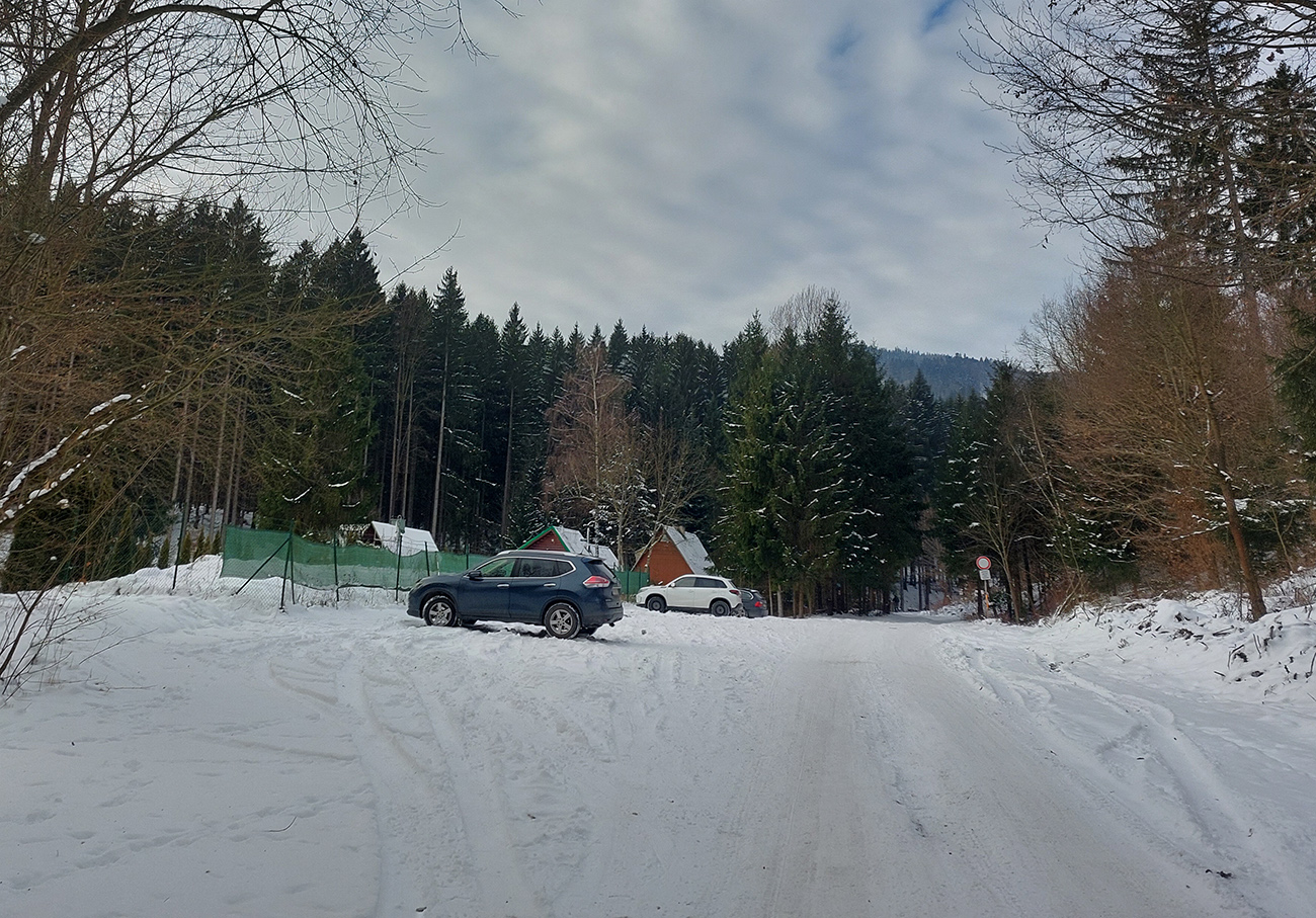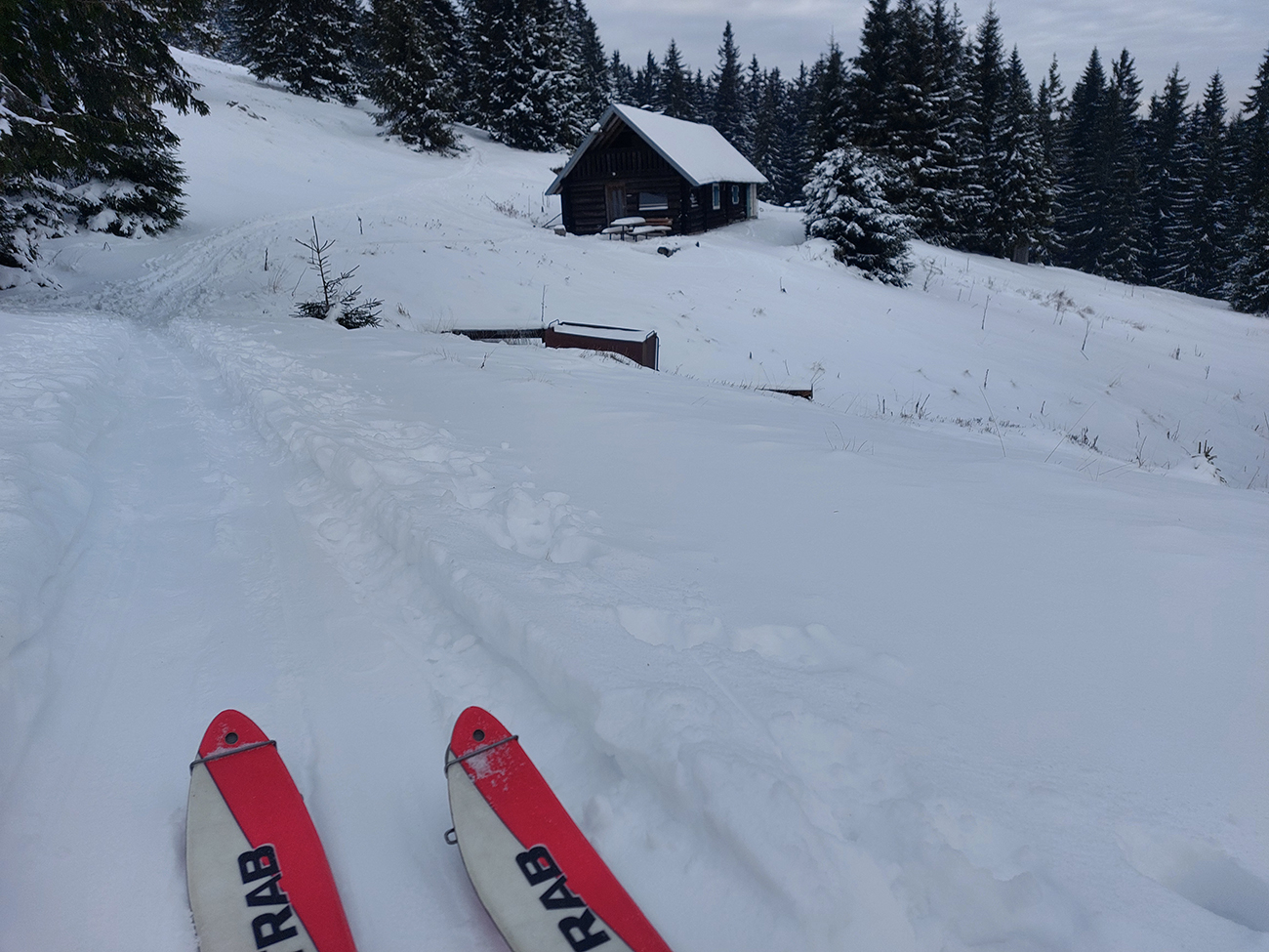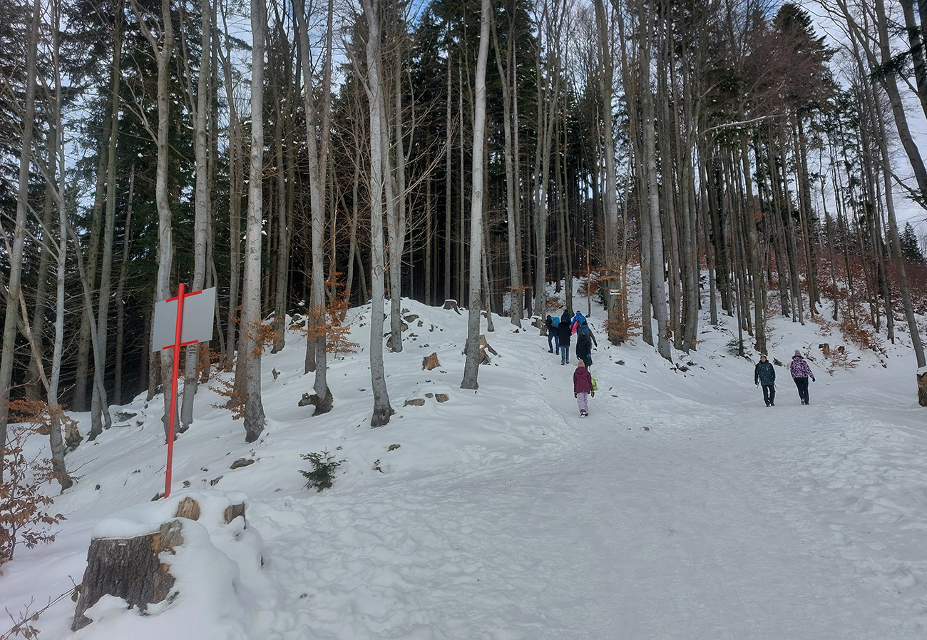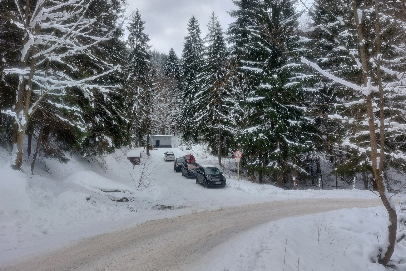Jasná správa: kto chce ísť teraz na Hole na pásoch, oveľa lepšie spraví, keď pôjde z Vrútok a nie z Martina. Serpentíny zo Strání, spod starej lanovky (žltá značka) sú od mostíka také zodraté pešiakmi, že ažžžž. Zato od rampy v Jedľovinách, kde vyberajú poplatok za cestu, sa v podstate dá hore aj dole od auta. Zaparkovať je kde na dvoch malých parkoviskách hneď nad rampou. Cesta „investička“, ktorá odtiaľ vedie na tie Stráne, je spevnená, pokrytá pár cenťákmi autami ujazdeného a pešiakmi uchodeného snehu, ideál aj pre mtb. Síce na začiatku (medzi parkoviskami a za prvou zákrutou) cvakajú zubami húfy malých piraní, ale cestou hore je ľahké sa im vyhnúť a cestou dole sa dajú opatrne poobchádzať. Alebo už zniesť, je to k rampe ani nie 500 m. Od krmelca na prvom kopčeku je to už pohoda hore aj dole, samozrejme s trochou pozornosti. Takto to vyzeralo, len som na jednom mieste trochu experimentoval a moc to nevyšlo, na to upozorním nižšie. No v tejto biede treba improvizovať, čo už...