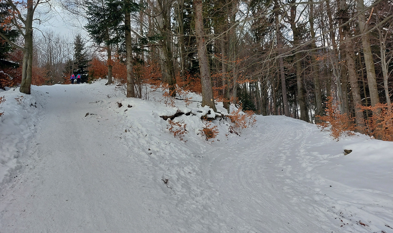 Takže investička na pohodu, len za prvou zákrutou a za tým spomenutým krmelcom treba opatrnejšie, no dá sa v stopách po autách aj stredom. Potom odbočka doprava na Medvediu cestu a komfort v dvoch tvrdých stopách alebo v mäkšom strede pokračuje, v podstate až kým sa cesta nenapojí na serpentíny pod Hodinovkou (pod delom).