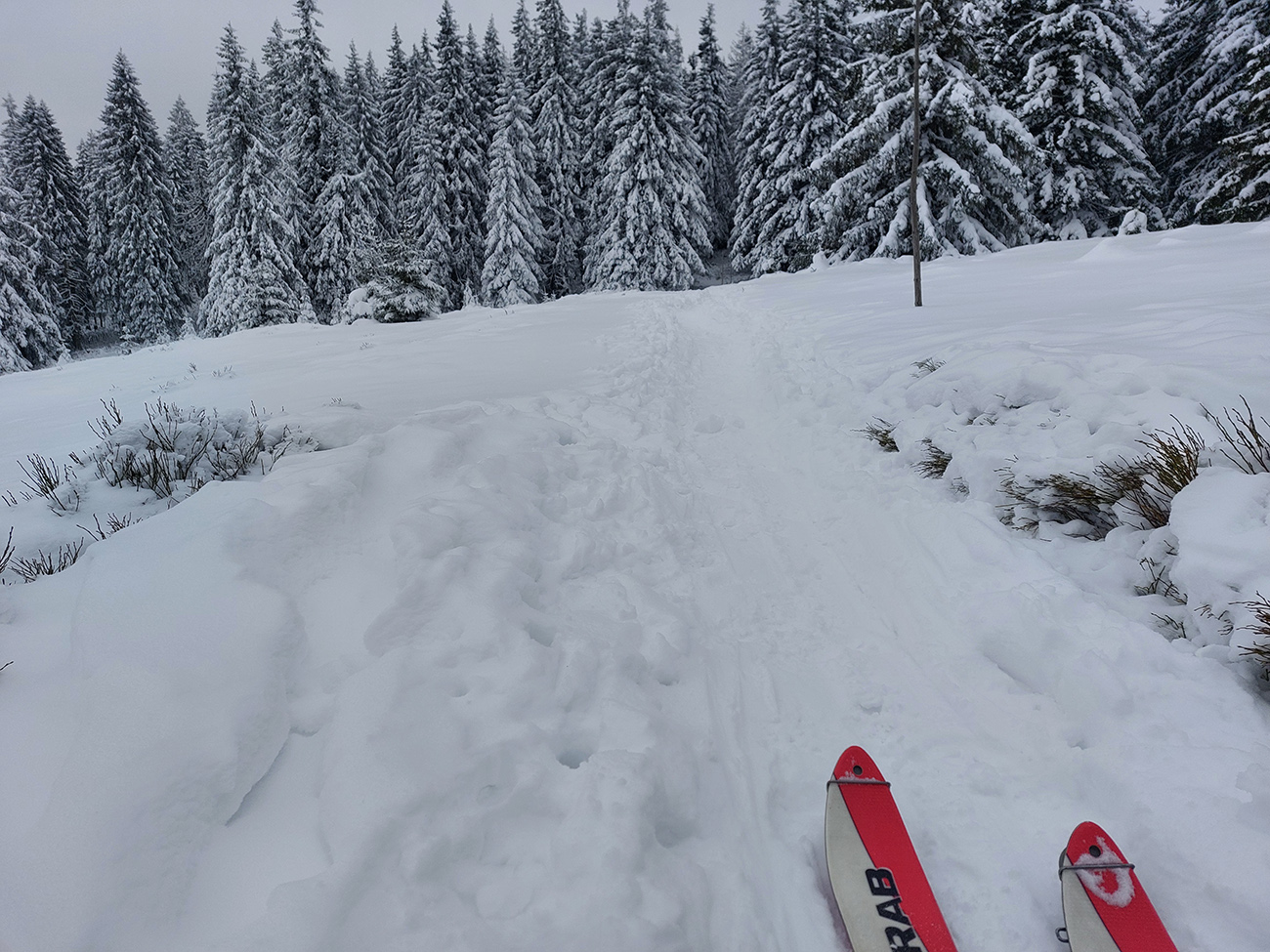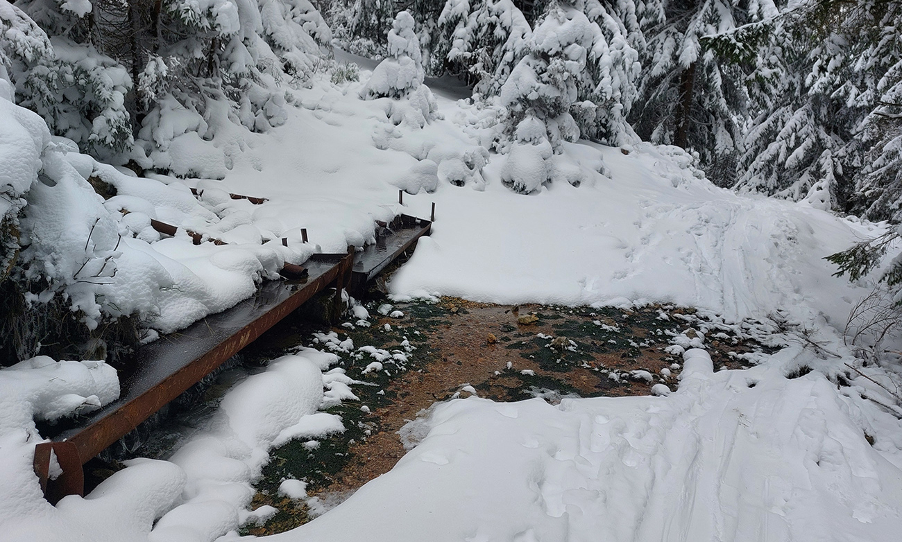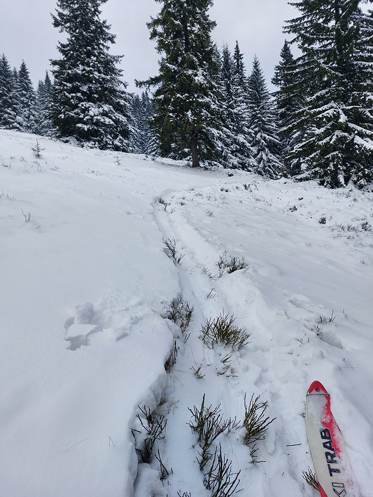 Cez lúky popri chalupách, lesom popri napájadlách a cez horný okraj Dlhej lúky až do sedla Prašivé všetko v pohode, ale na túto nadmorskú výšku ozaj žalostne málo snehu. Kľúčové sú napájadlá, ale dá sa cez ne opatrne prejsť „suchým pásom“.