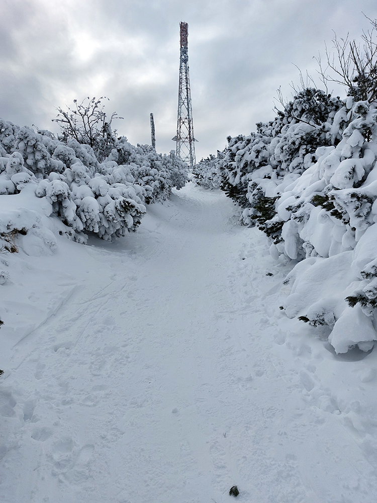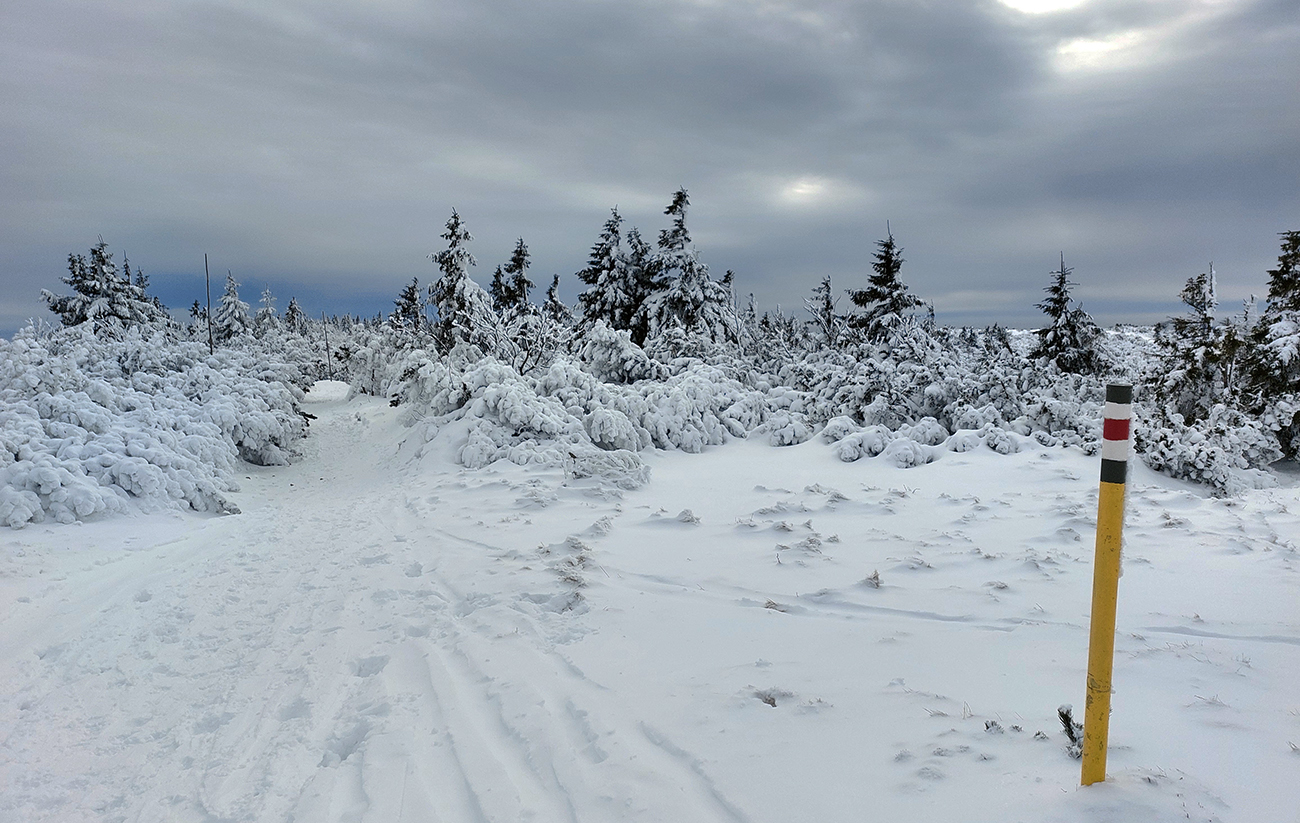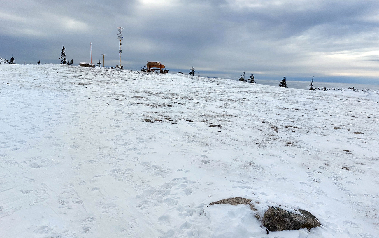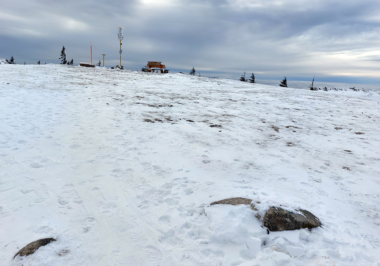 Ešte som odskočil k malému vysielaču na Veľkej lúke – záverečný válov v kosovke pekne vysnežený, aj cesta od vysielača kosodrevinou ďalej smerom na Vidlicu, len okolo smerovníka kameňolom. Vietor na holých plochách spravil medvediu službu všade.