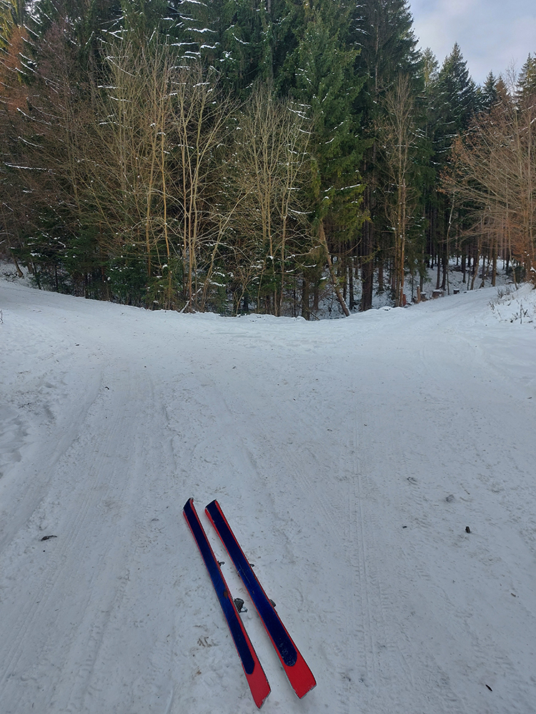 A potom už len dole – v podstate až k cintorínu na „Kolónke“. Prenášal som len kúsok v strmej skratke pod delom a okolo tých piraní nad rampou. Rovinky na Medvedej ceste som potlačil a prekorčuľoval, rovnako ako krátke stúpanie na investičke pred krmelcom. Na tú biedu skoro by som povedal, že paráda. Ale nech už sakra pripadne :-)))