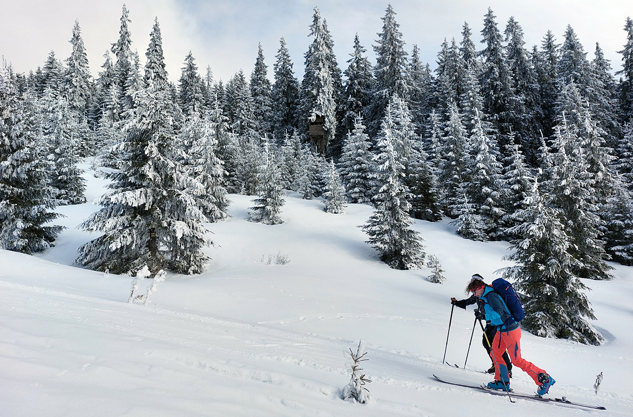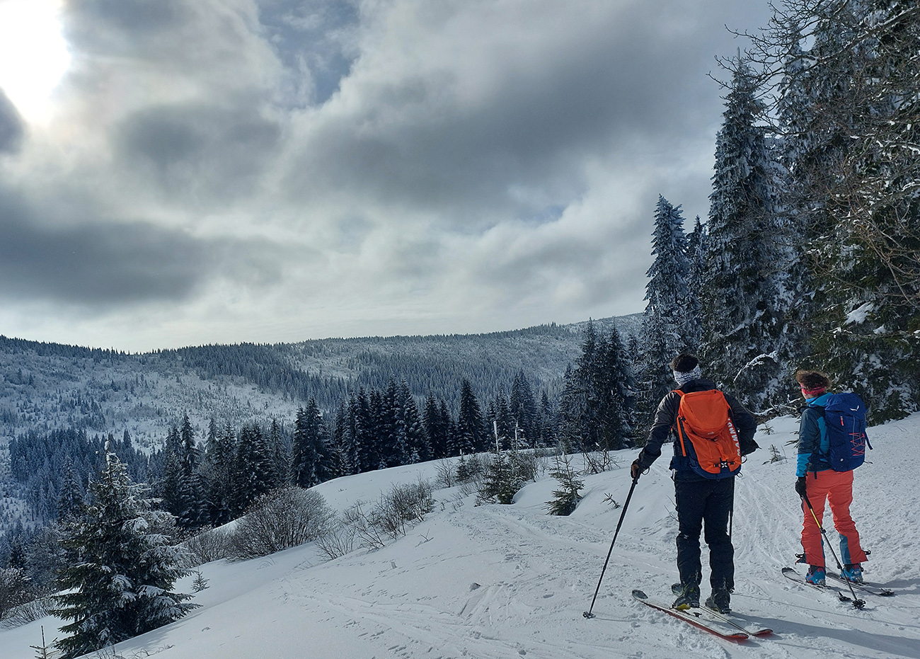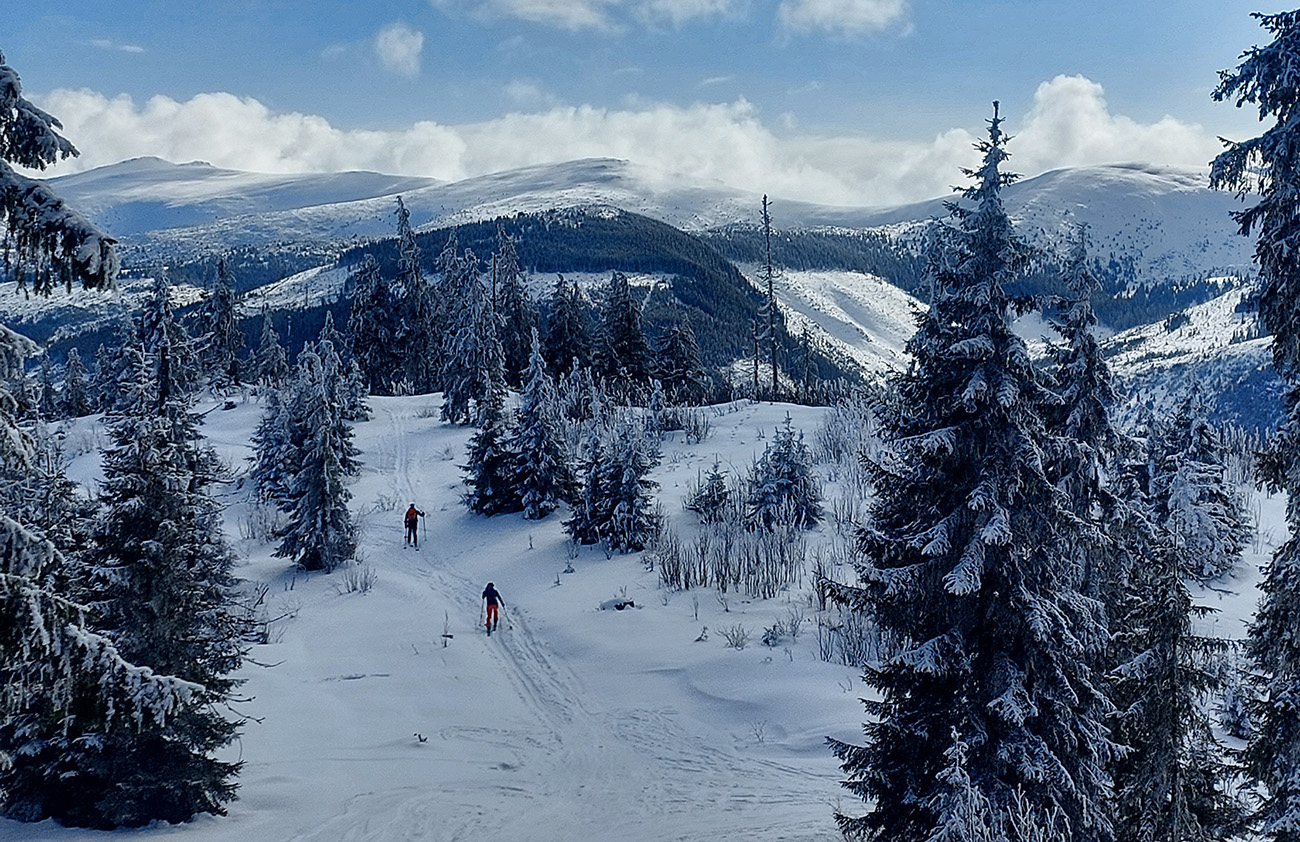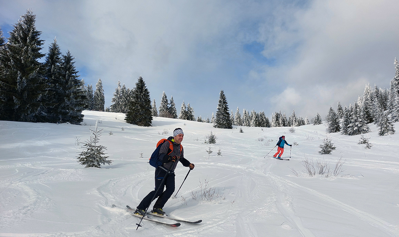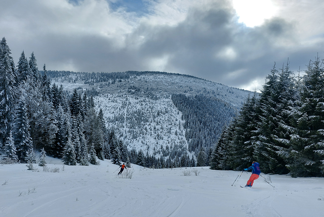 A vôbec to po odmäkoch nebolo ľadové, na starom firne ľahký, premrznutý poprašok, pohodlné! Takže super aj neskôr, pri zjazdoch na pásoch – netrpeli chlpy na ľade a ticho bolo. Hore nad lesom pekný spätný výhľad na Tatry, kde sa ozaj na hrebeňoch dáke chuchvalce držali, zdalo sa: