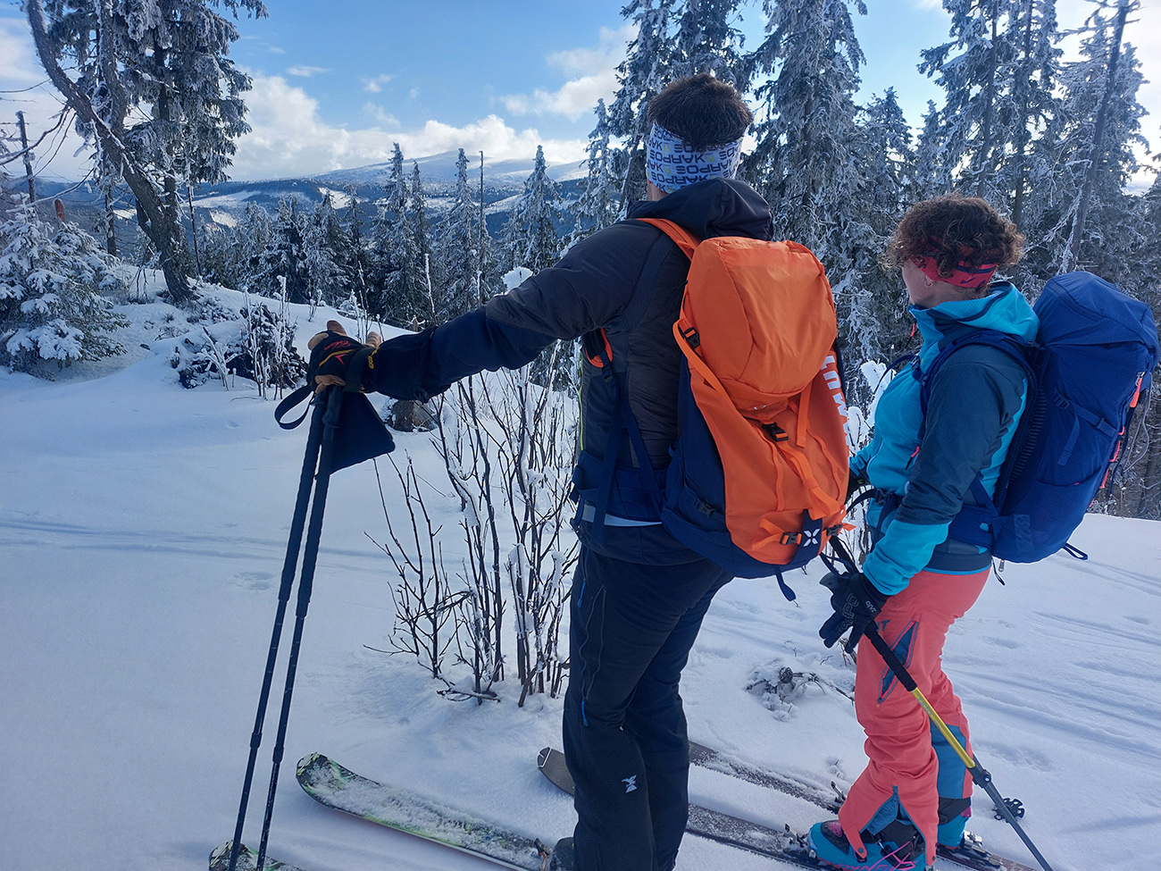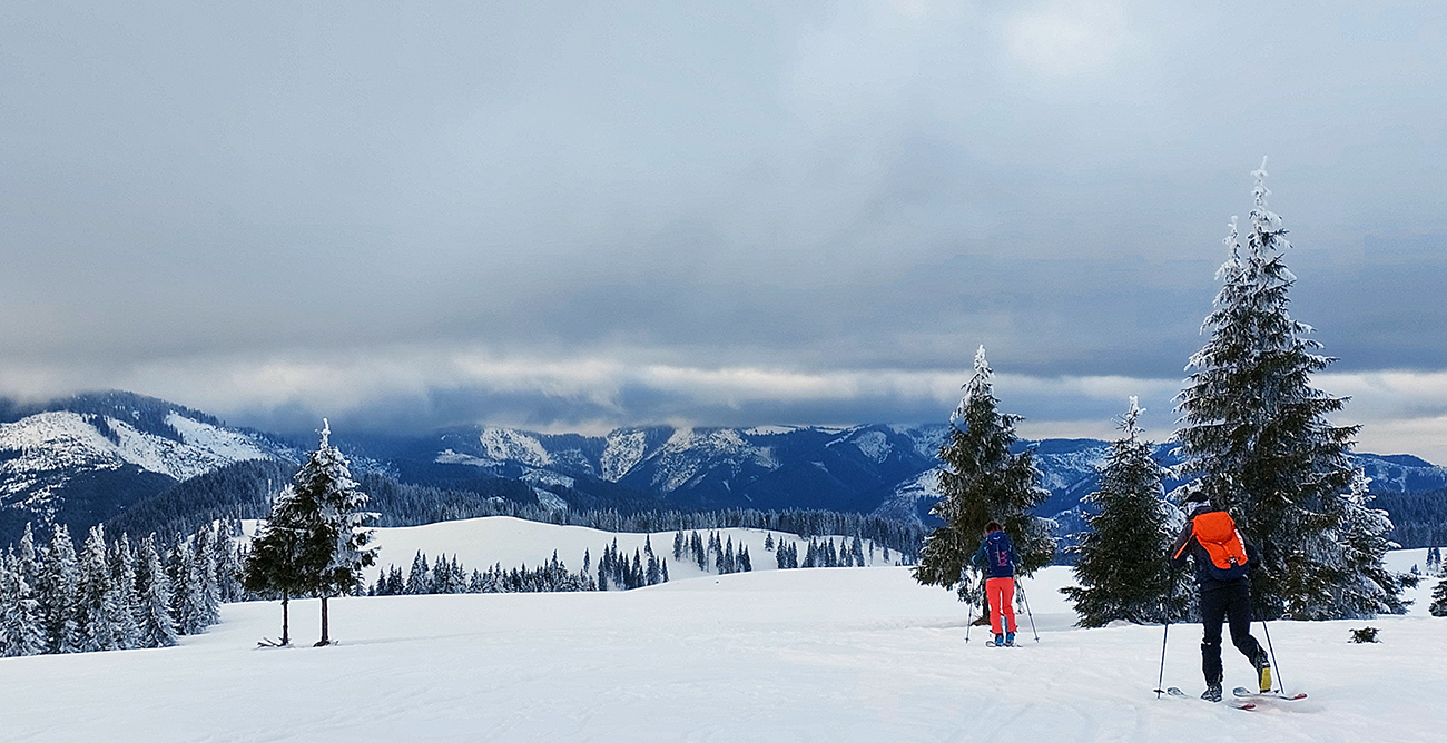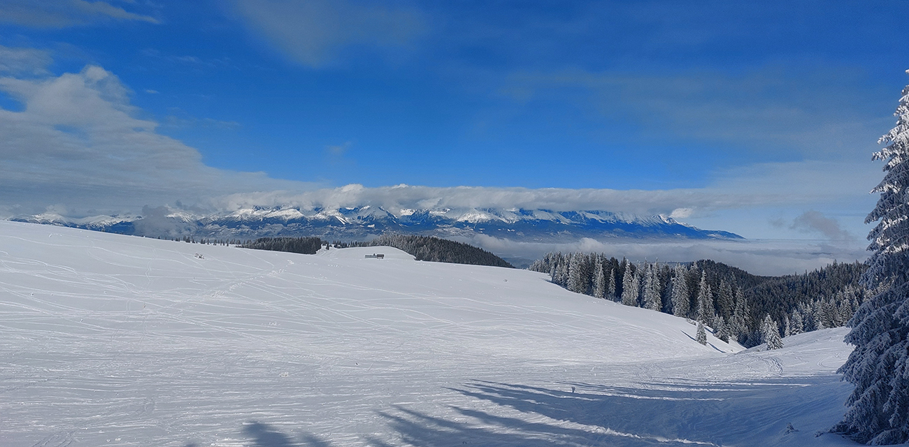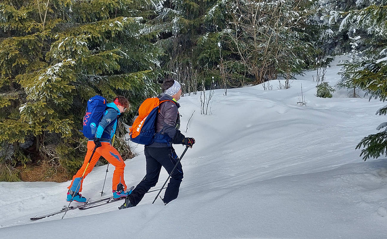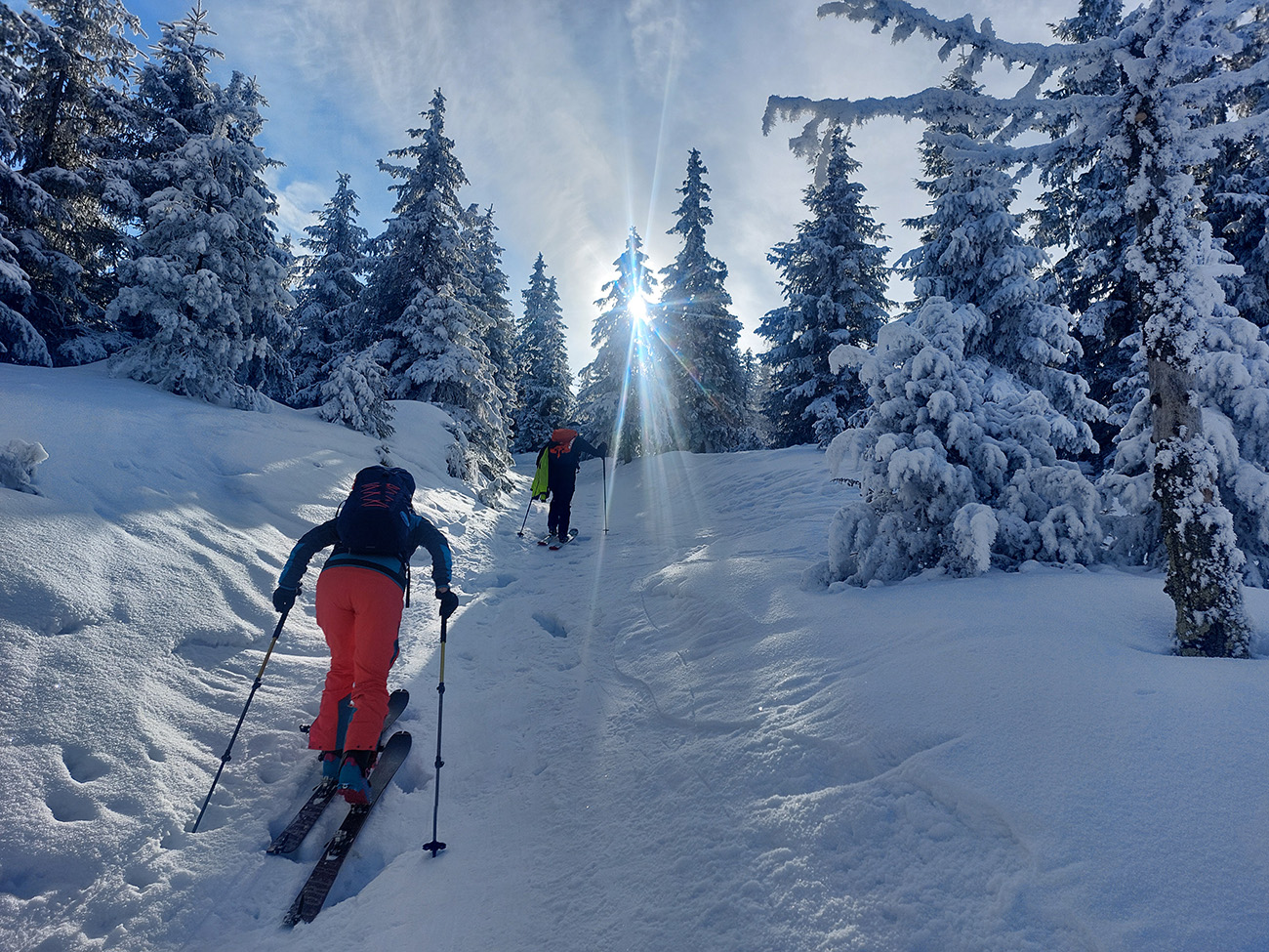 A vôbec to po odmäkoch nebolo ľadové, na starom firne ľahký, premrznutý poprašok, pohodlné! Takže super aj neskôr, pri zjazdoch na pásoch – netrpeli chlpy na ľade a ticho bolo. Hore nad lesom pekný spätný výhľad na Tatry, kde sa ozaj na hrebeňoch dáke chuchvalce držali, zdalo sa: