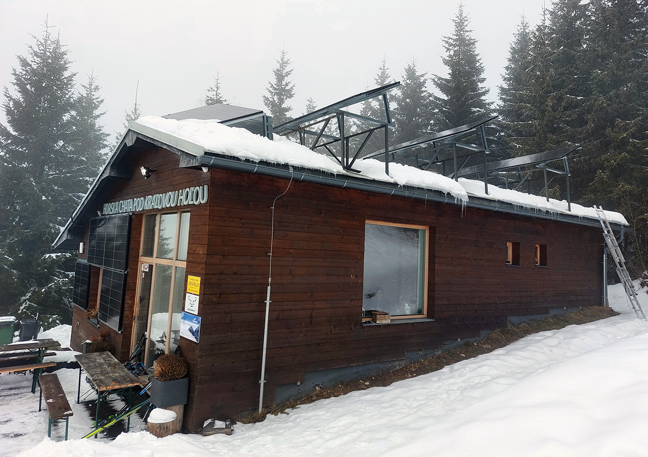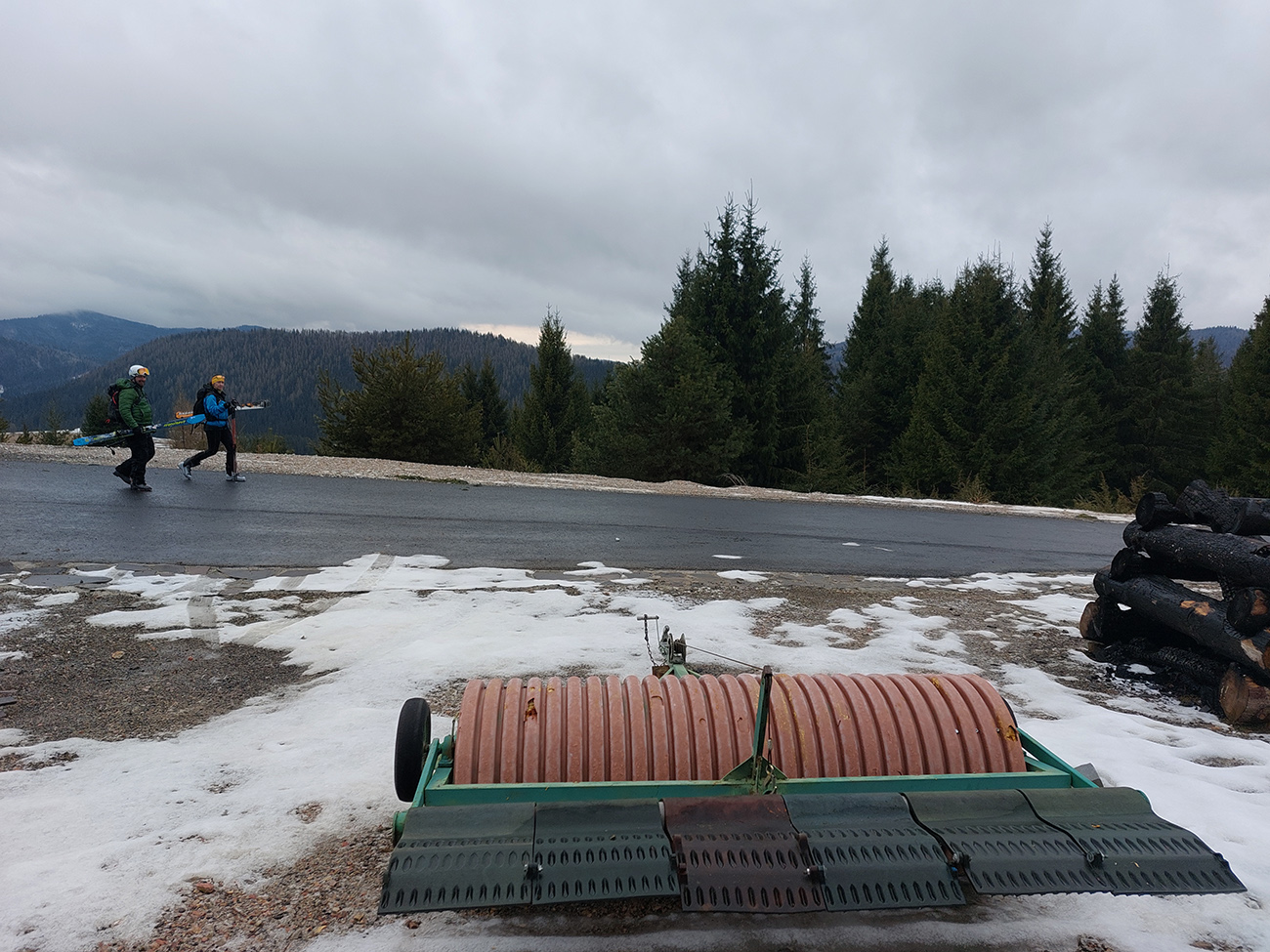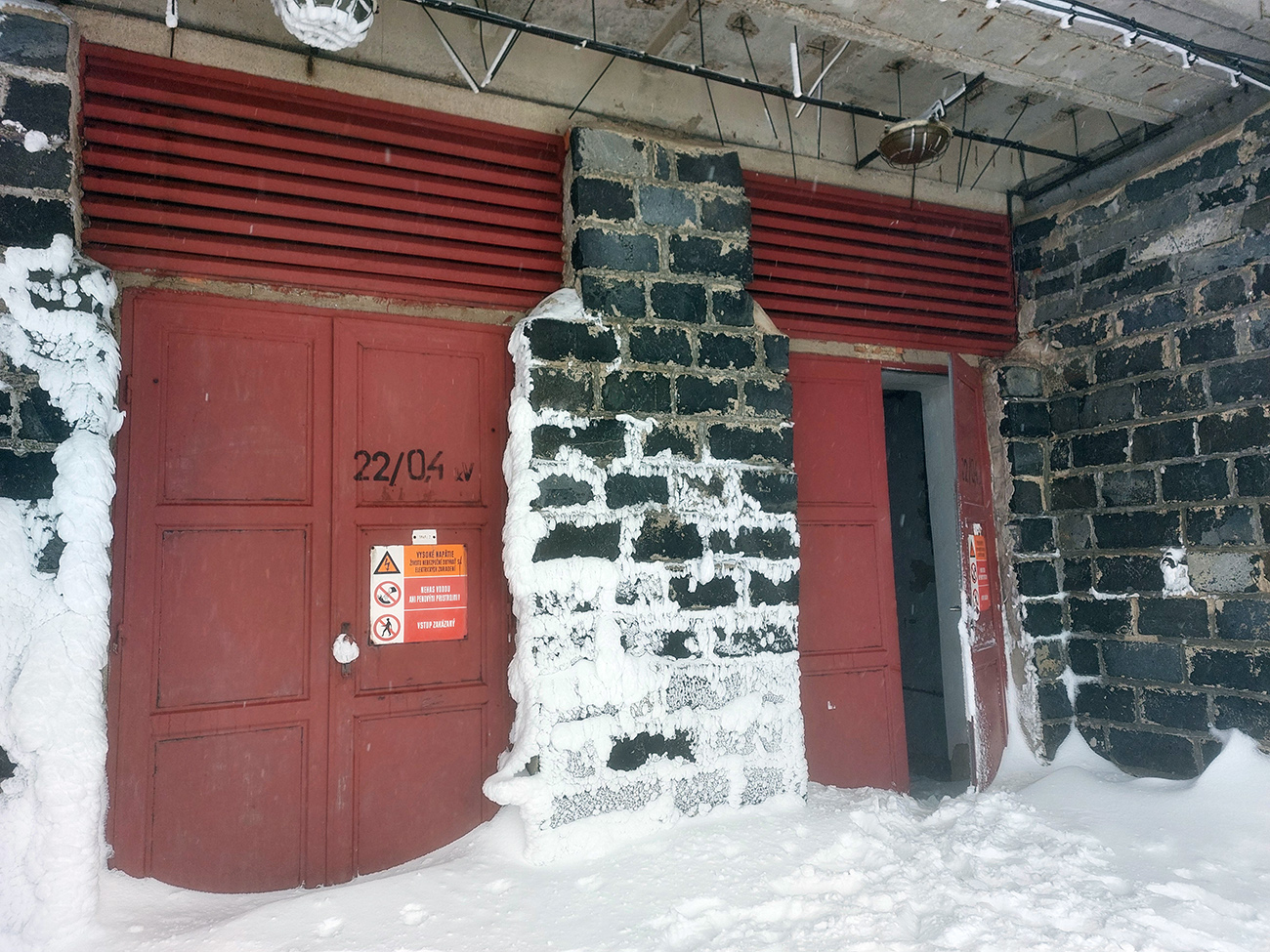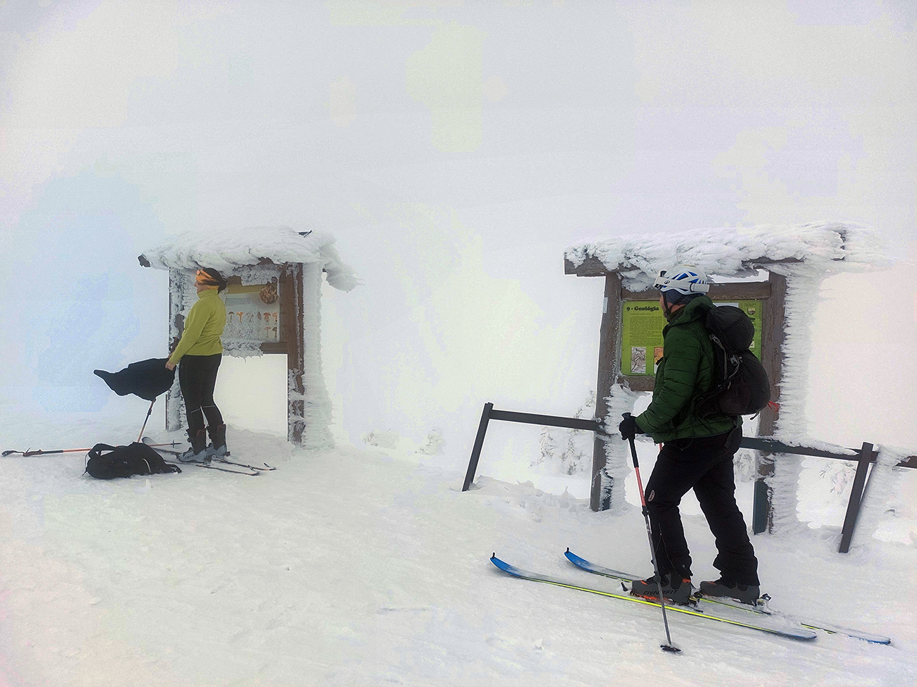 Počasie však čoraz horšie – jz víchor sa dvíhal. Našťastie ešte cestou hore tlačil do chrbta, viditeľnosť však nulová, difúzna. Aspoň, že na nás snežiť prestalo, v tom predpoveď vyšla. Iba dáke ihličky vzduchom lietali. Takže hore pekne po tyčiach a rýchlo do závetria za východnú stenu vysielača, pred vchody ku trafákom – jeden bol dokonca otvorený (či vylomený?) a interiér za ním zjavne už mnohým poslúžil.