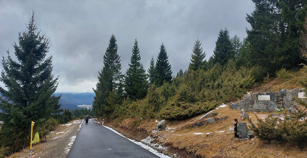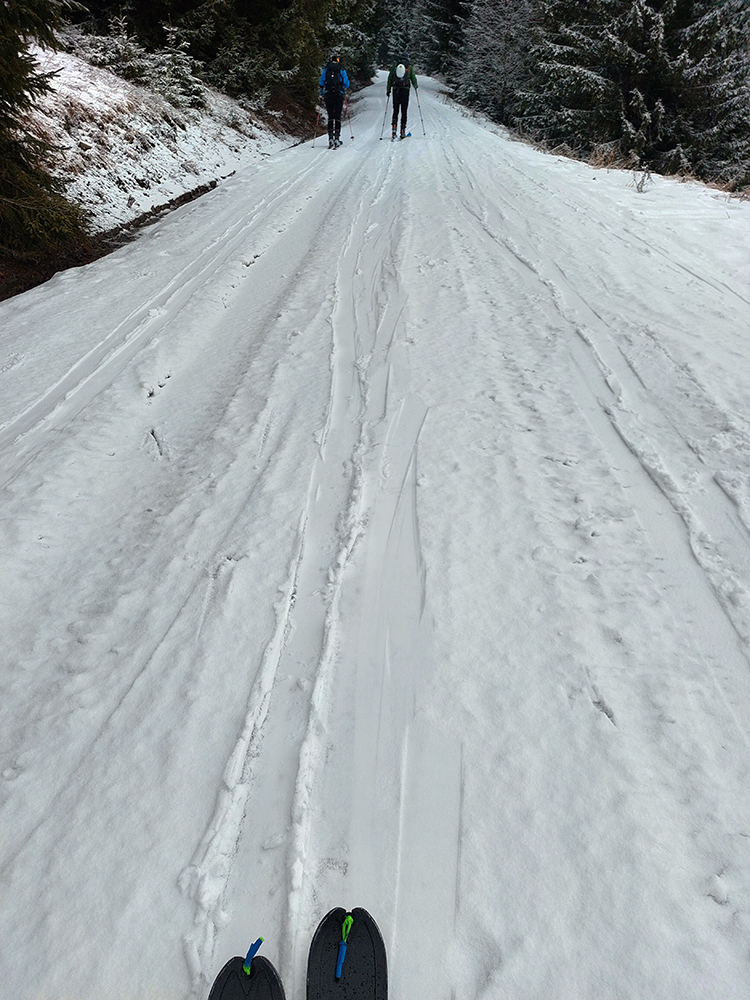 Cesta uvalcovaná, rovná, pod popraškom mokro ľadová – čím nižšie, tým mokrejšia. Na otvorených úsekoch miestami aj koľaje až na asfalt. Vyzuli sme niekde medzi spodkom kalvárie a odbočkou modrej značky (asi 960 m).