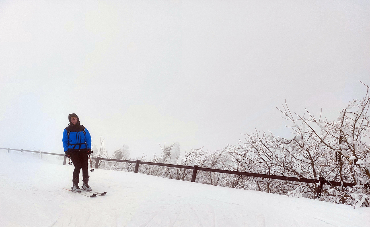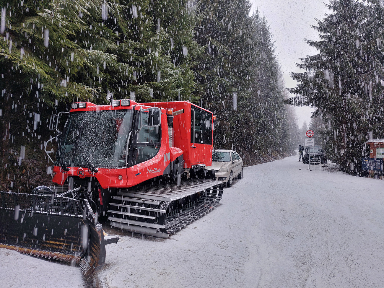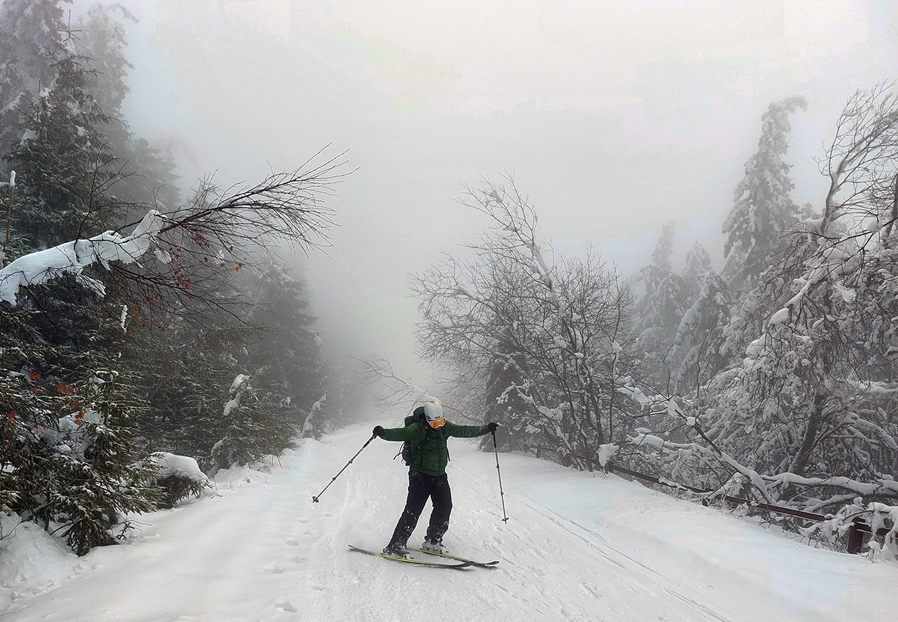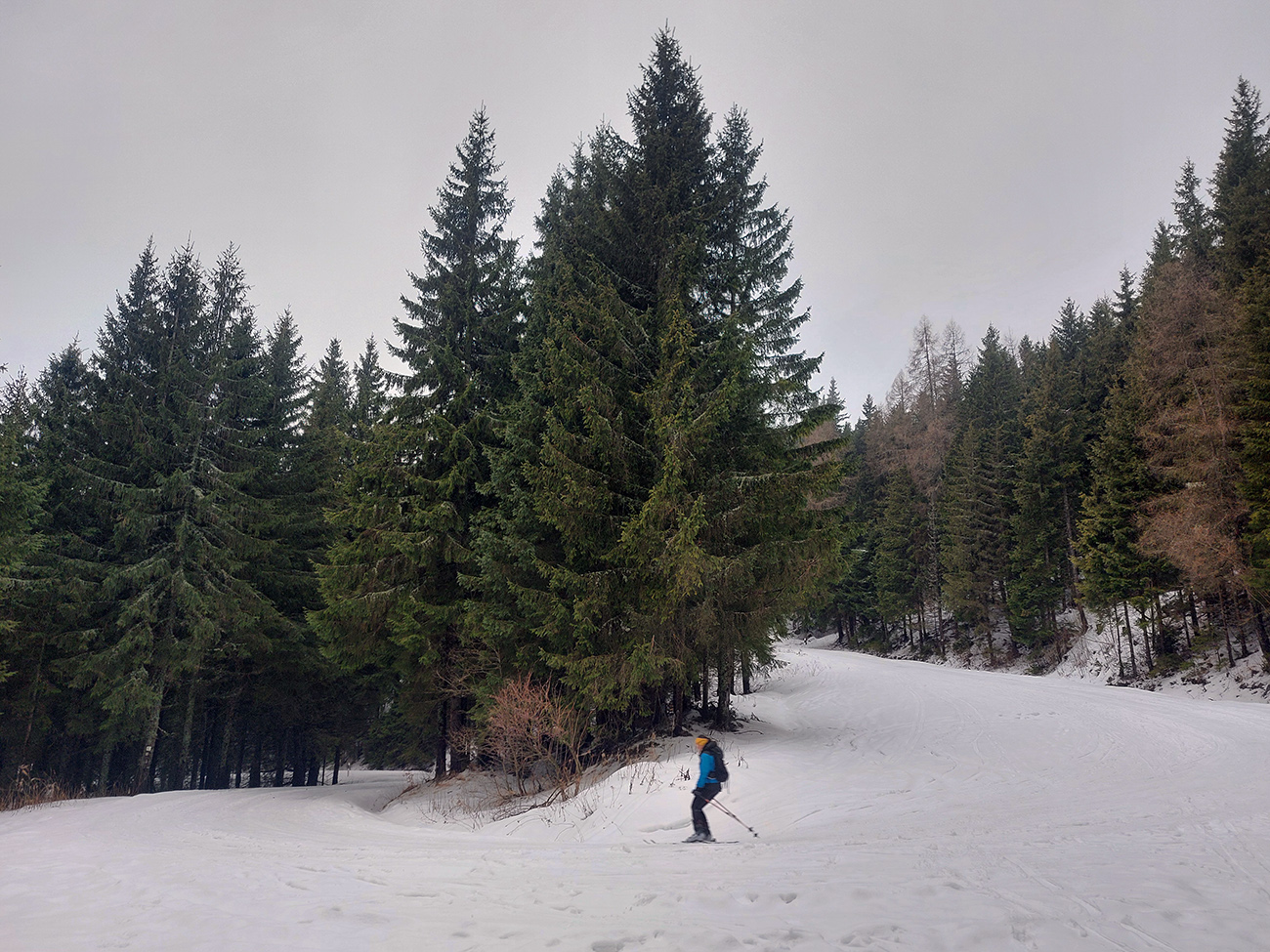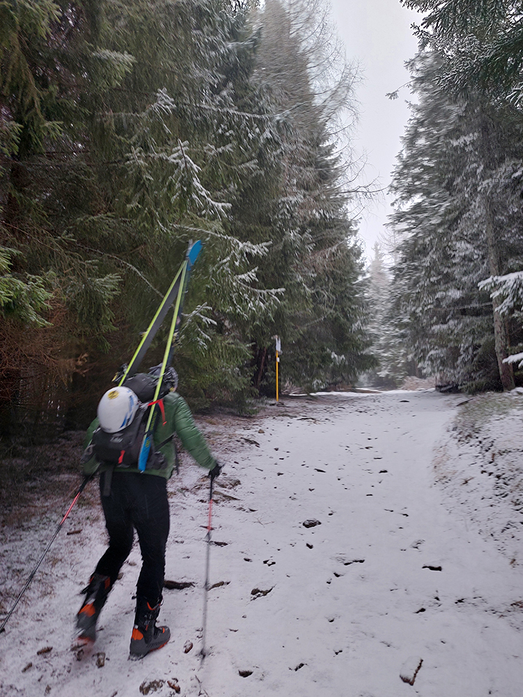 Hneď na úvod – nedá sa od parkoviska! Ale má snežiť, po ceste to pôjde. Lebo na valentínsku sobotu bolo hlásených málo oblakov, žiadny vietor (ani hore!) a teplota tak do -6. Nemohol som odolať ponuke na odvoz, sám to mám z domu priďaleko. Do soboty rána síce na predpovedi pribudli oblaky, inak ale nič, tak v aute všeobecný optimizmus. Ten sa ale cestou dooooosť rozplýval. No už nebolo cesty nazad. Tak v Šumiac – city sme oferovali tri Eurá parkovného a našli sme hádam posledné miesto pod rampou. Tí, čo potom zaparkovali nad rampou, doooosť draho obišli. Keď sa poobede dole vrátili, už ich čakali „štátni výbercovia“. Vystupovali sme do poriadne hustého sneženia, ktoré hneď zakrylo zvyšky ľadu na ceste. Niektorí optimisti skákali do lyží už pri autách - hore cestou sa dalo, len potom vytopený úsek, bolo treba pár stoviek metrov nad rampou preniesť. My sme poctivo vyniesli na batohoch po turistickom chodníku až na serpentínu cesty na Skaličke (1100 m). O poschodie vyššie na Grúniku (1300 m) sme sa už odvážili aj mimo cestu. Odtiaľ sa už podklad rýchlo zlepšoval – snehu pribúdalo a práve potiaľ by som si to trúfol zlyžovať aj mimo cesty.